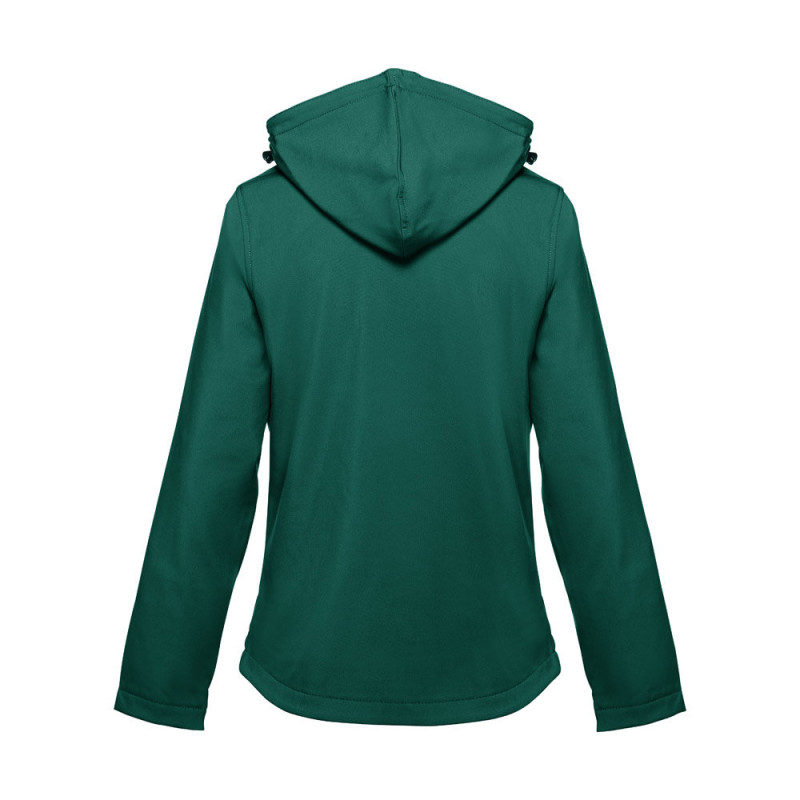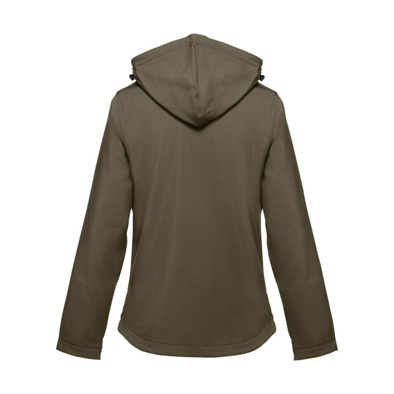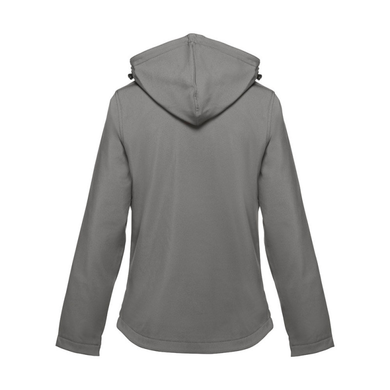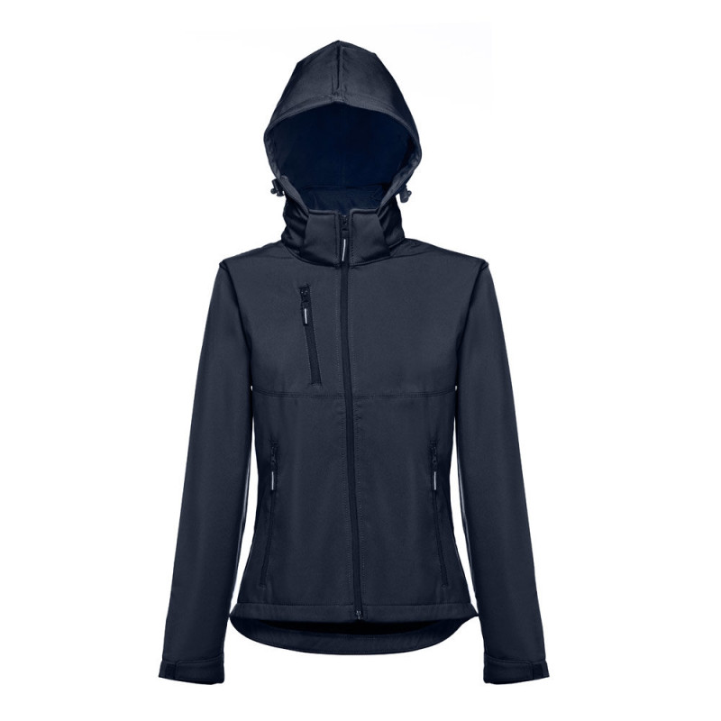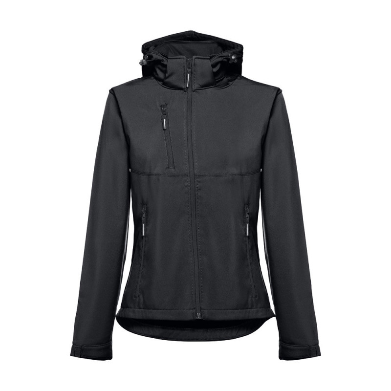 Softshell vest for women in 96% polyester and 4% elastane (280 g/m²), with two layers, removable hood and water-resistant coating. Lined jacket with 2 front pockets and diagonal chest pocket, all with zips. Adjustable cuffs with self-adhesive hook and loop fastener. Removable hood with drawstring and self-adhesive hook and loop fastener to attach to the collar. Rounded hem on the back. Sizes: S, M, L, XL, XXL