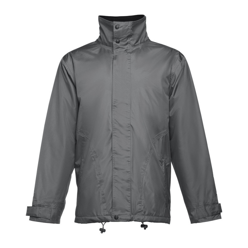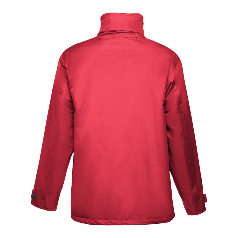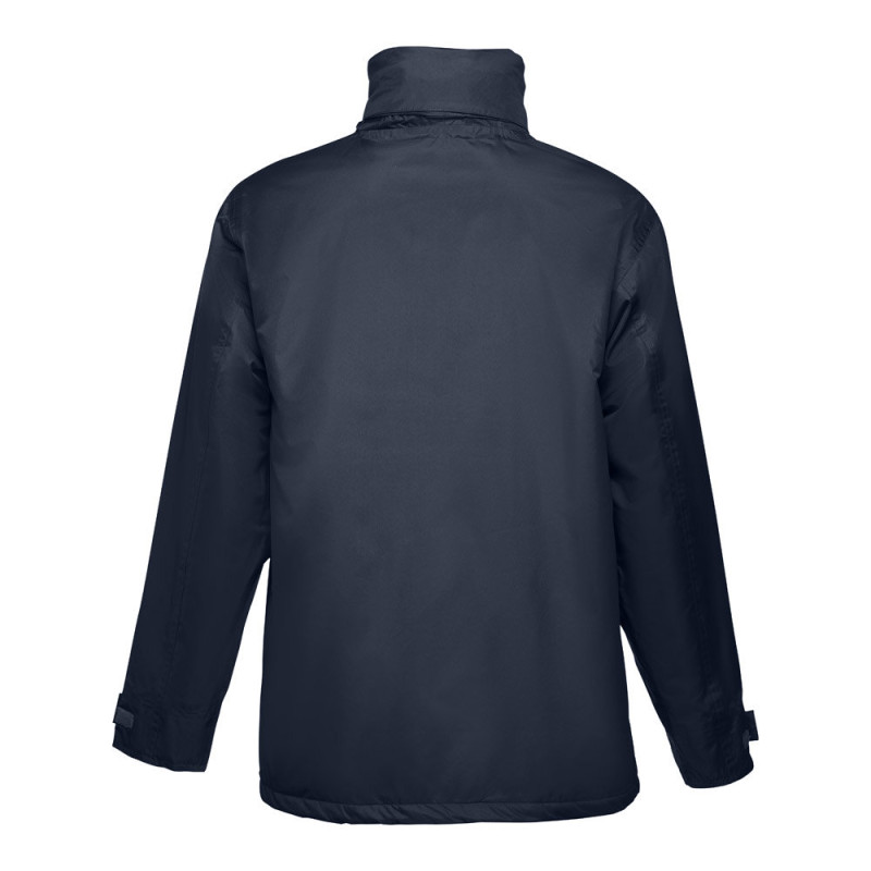 Padded parka (unisex) 100% polyester (exterior: 240 g/m² 100% polyester pongee 240 and waterproof PVC coating, interior: 65 g/m² 100% polyester taffeta, filling: 100% polyester 80 g/m²). Collar lined with black polar mesh fastened with a self-adhesive hook and loop closure. Foldable collar hood, adjustable with black stoppers. Opening with flap, coloured zip, self-adhesive hook and loop fastener and snap buttons in black. Features 2 outer pockets with flap and 2 inner pockets (1 for mobile phone) with hook and loop fastener. Inner 2x2 ribbed mesh cuffs and adjustable outer cuffs with adjustable hook and loop straps. Thermo-sealed seams. Zipped lower back access for easy customisation. Sizes: XS, S, M, L, XL, XXL