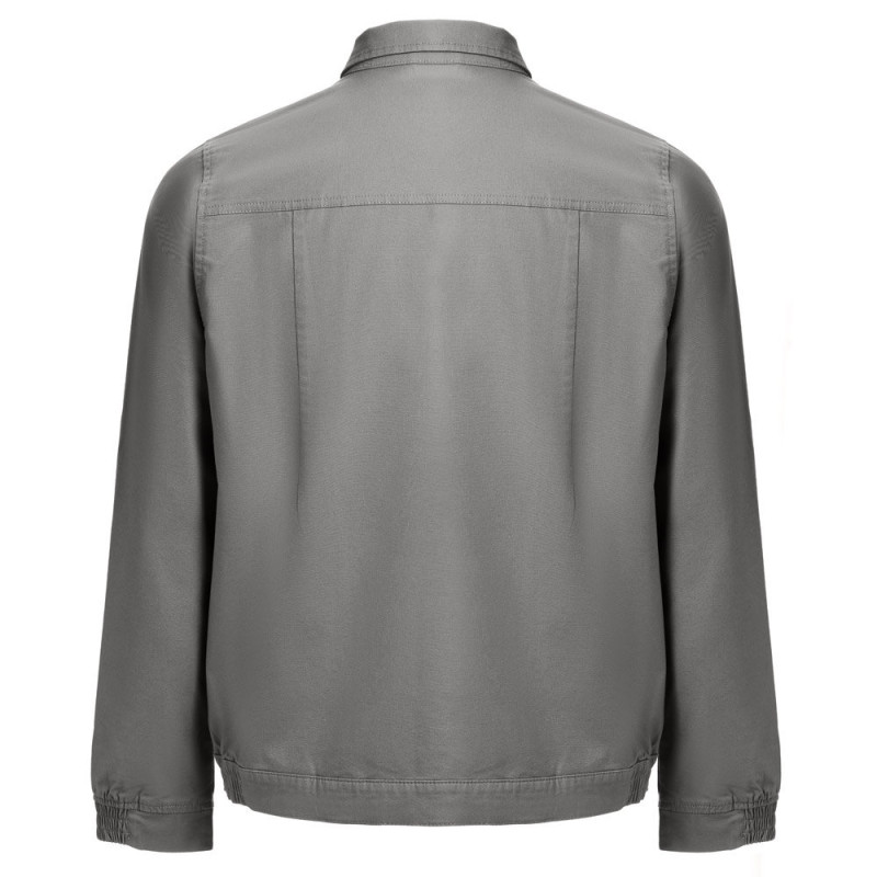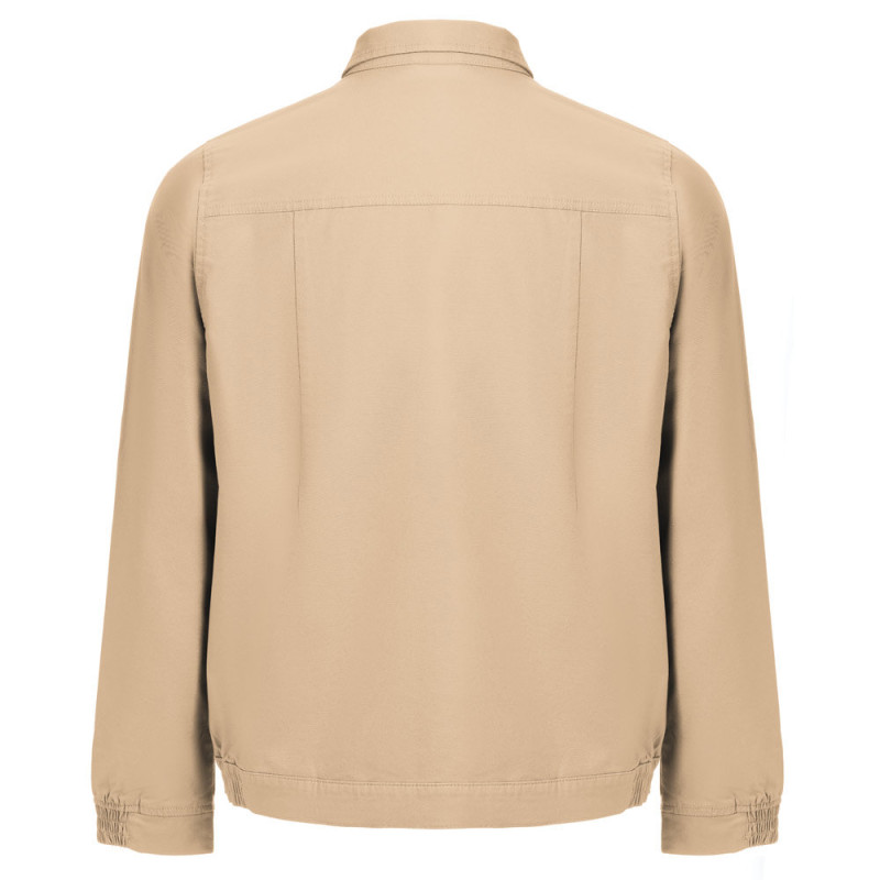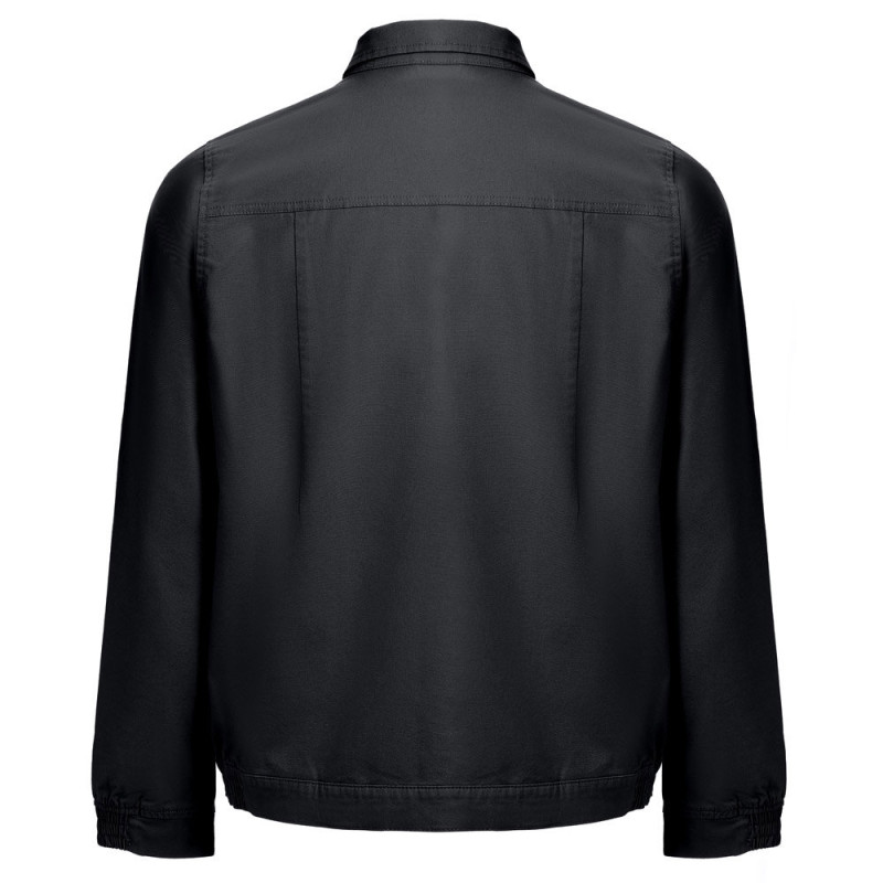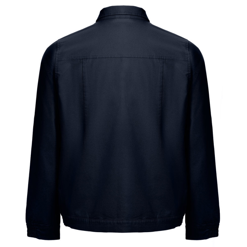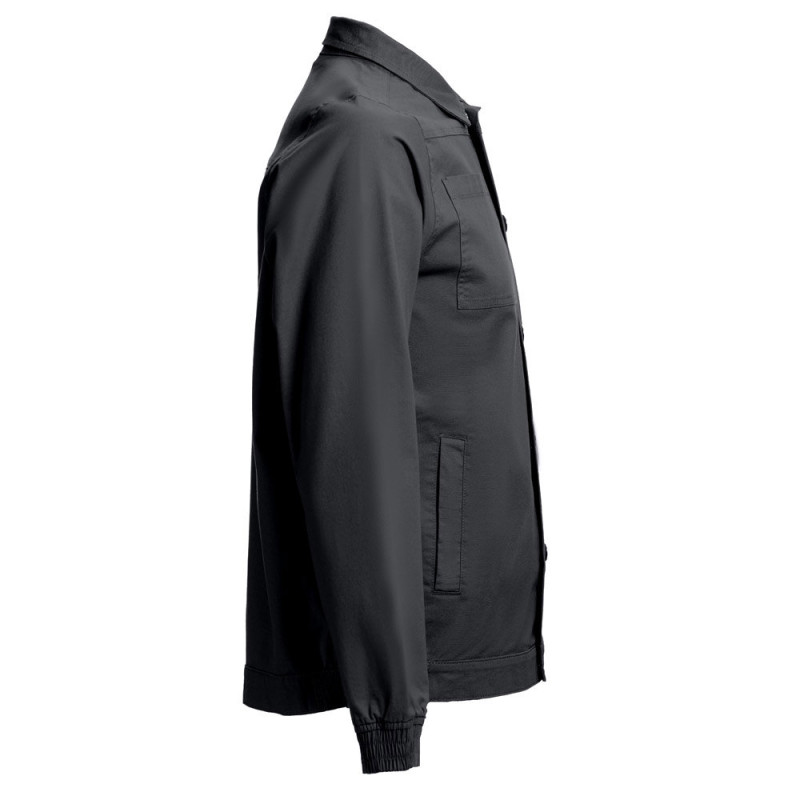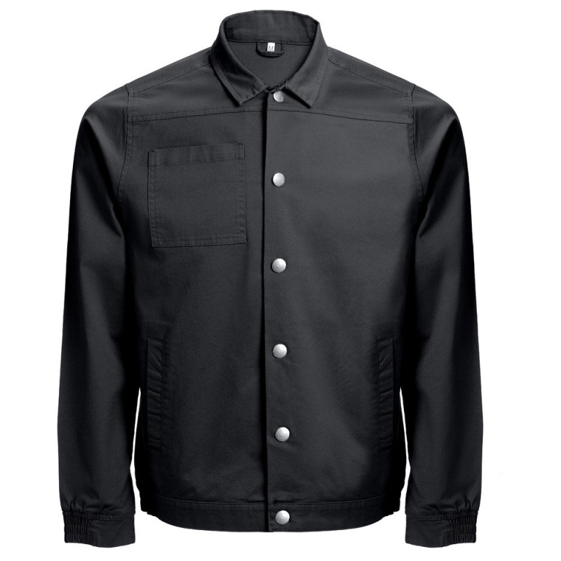 98% cotton and 2% elastane jacket (240 g/m²). Modern cut, it contains 2 darts on the back and elastic on the wrist and waist. Buttoning done through snap buttons. Includes 2 back pockets and 1 chest pocket. Sizes: S, M, L, XL, XXL, 3XL