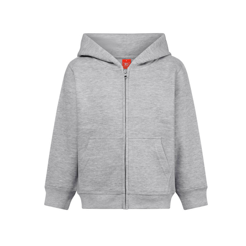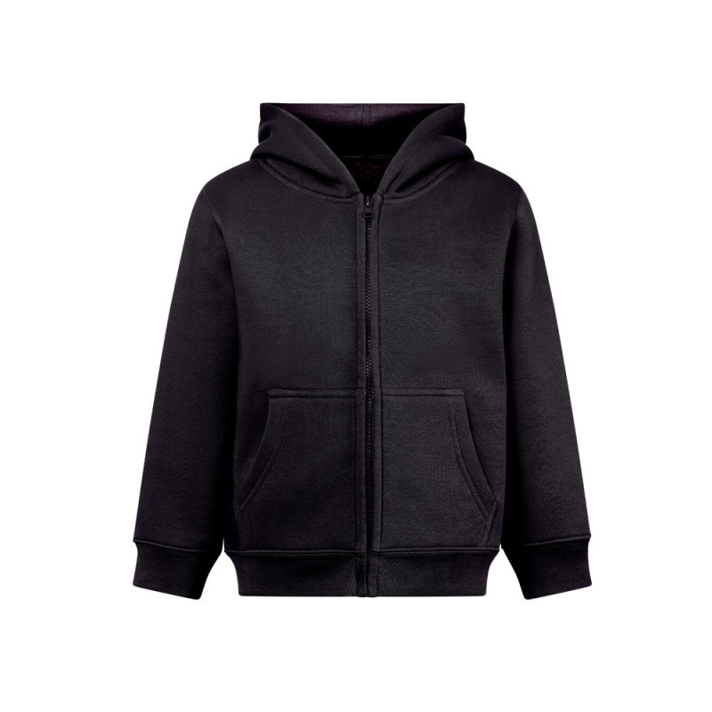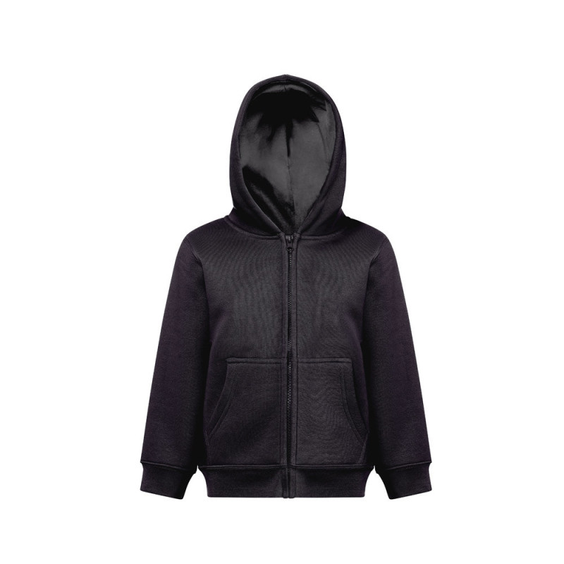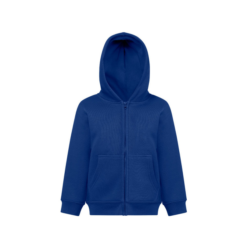 Enzyme-treated children's jacket in America terry (50% cotton using sustainable farming practices) and 50% recycled polyester (320 g/m²). Hood without drawstrings and lined in jersey in the same colour as the jacket, complying with European Union safety standards. Contains 1x1 rib cuffs and bottom, 2 side pockets, zipper with slider, puller and carded interior. Sizes: 4, 6, 8, 10, 12
