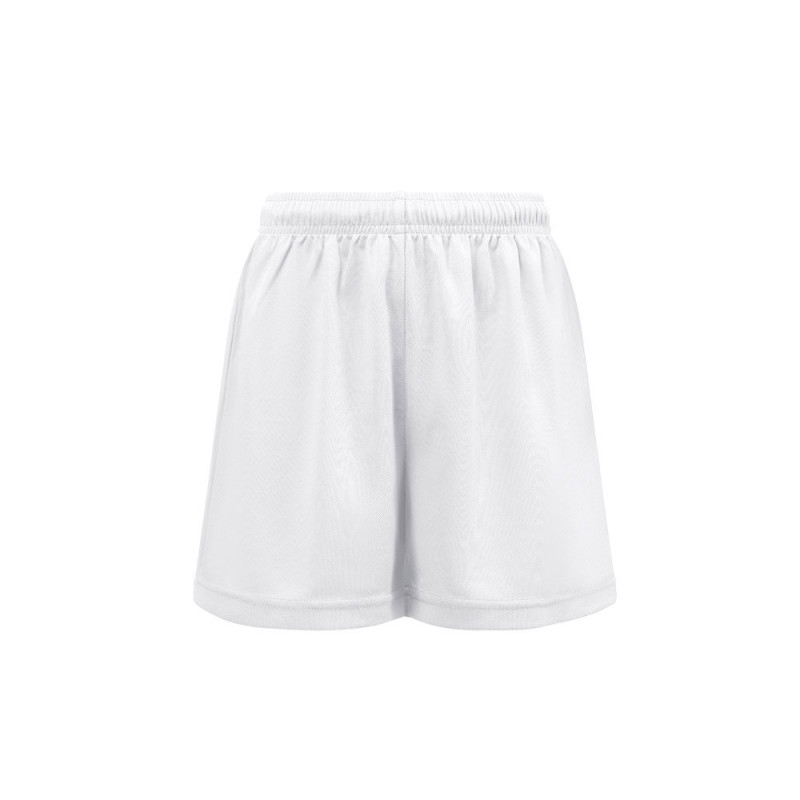 Children's sports shorts in 100% recycled polyester pique mesh (150 g/m²). Breathable fabric for greater comfort during outdoor activities. Elastic waistband with pleats and drawstring in the colour of the shorts. Double-stitched at the hem of the garment. Sizes: 4, 6, 8, 10, 12