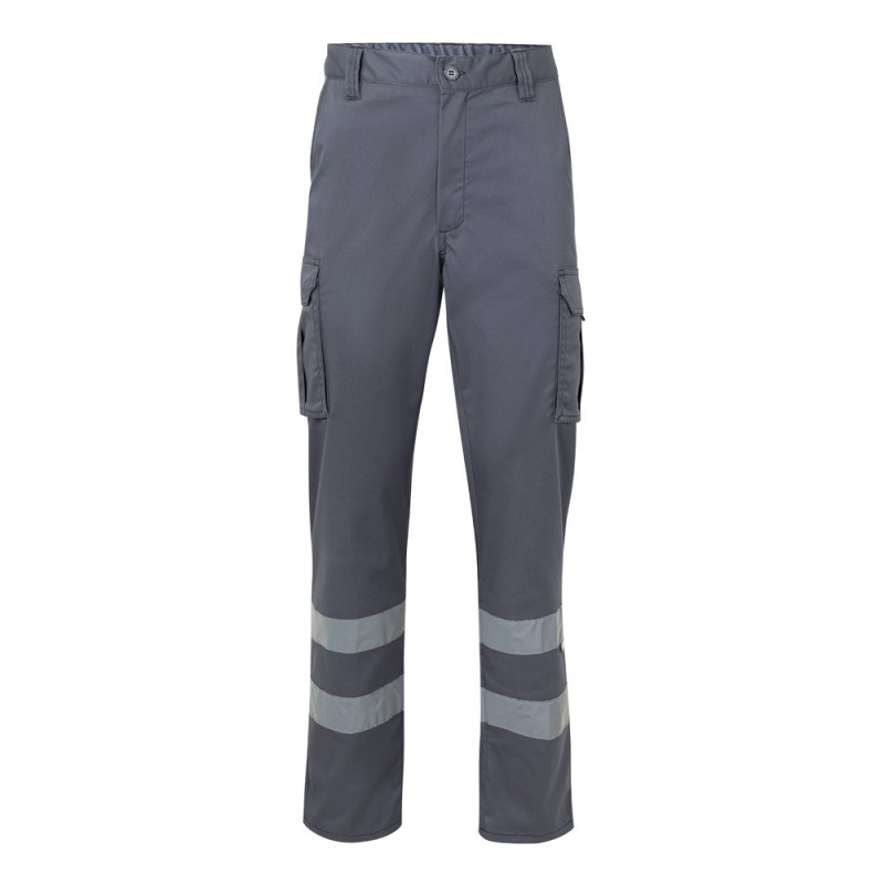 Multi-pocket stretch trousers (240g/m²), in cotton (46%), EME (38%) and polyester (16%). Elasticated waistband, reflective stripes on the bottom of the trousers and six pockets (2 French pockets, 2 side bellow pockets and 2 back bellow pockets). Product in compliance with EU Reg. 2016/425, certified by EN17353 and class Nº B2. Size: 34, 36, 38, 40, 42, 44, 46, 48, 50, 52, 54, 56, 58, 60