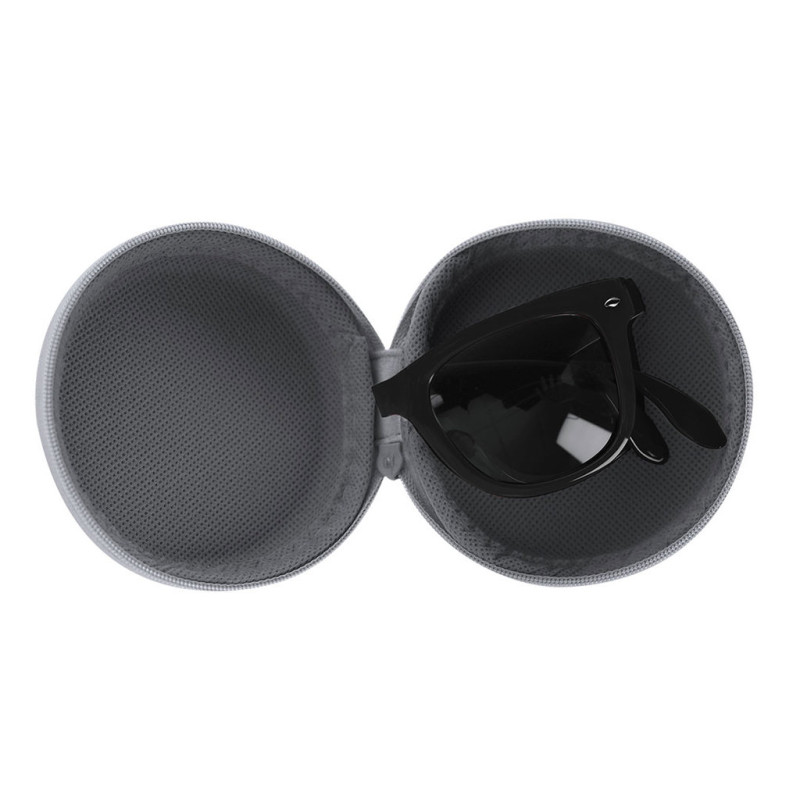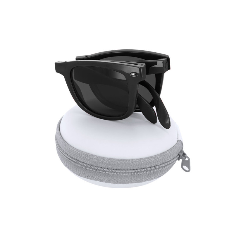 Folding sunglasses with UV400 protection, made of Recycled PC. Resistant folding frame with elegant design and shiny black finish. The lenses are black to ensure style. Presented in a round white case with zipper closure.