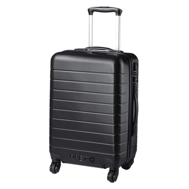 Impact-resistant, nature line, cabin trolley made of RPET material produced from recycled plastic, thus promoting the reuse of plastic waste and contributing to the sustainability of the planet. Telescopic carrying handle, with 4 swivel wheels and TSA security lock. RPET inner lining, with elastic fastening straps included. RPET emblem engraved at front.