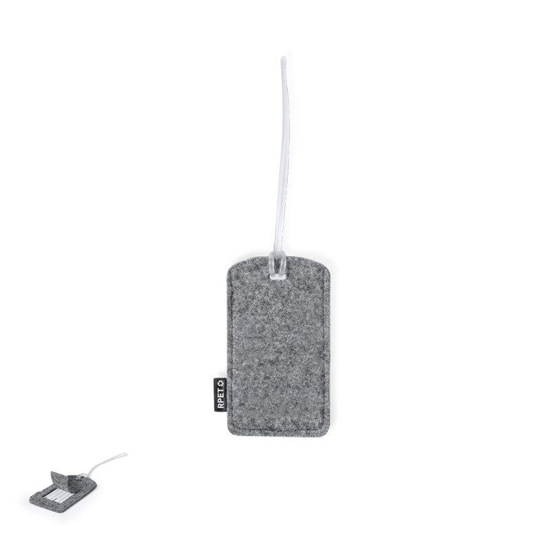 Luggage identifier made of RPET felt. Designed to be attached to any suitcase using its flexible strap and with a card for basic information. Made in RPET felt, with window and an RPET label.RPET felt is the result of the combination of the recycling processes of plastic materials along with the millenary technique of felt manufacturing, resulting in an eco-trend material that, in addition to being of recycled origin, also becomes recyclable.