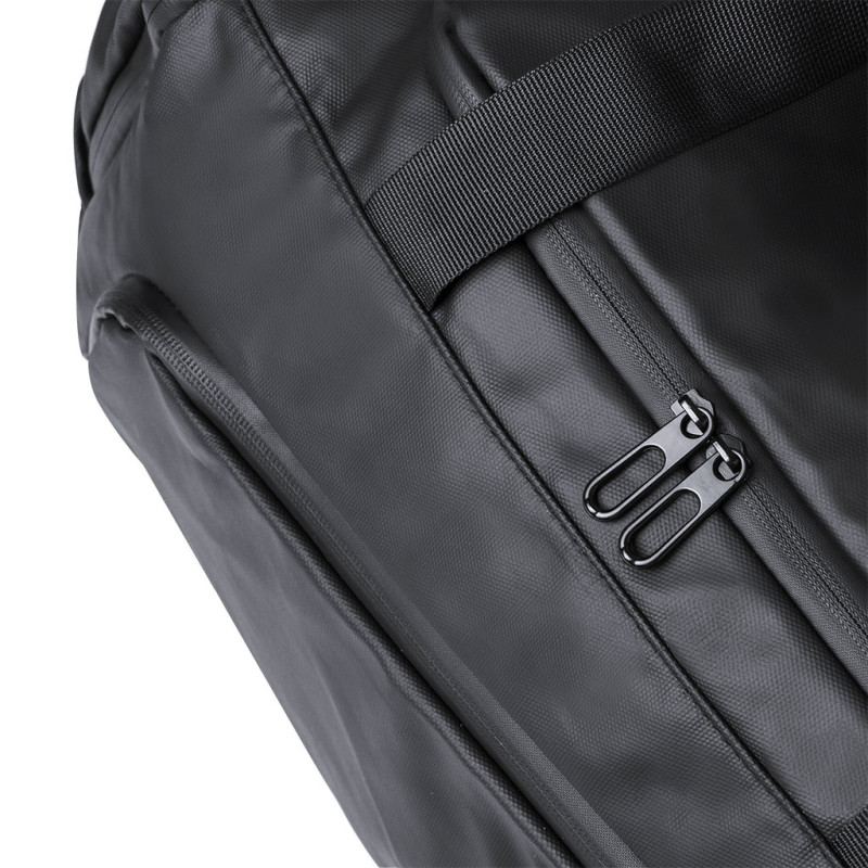 Backpack/bag made of resistant and soft PU leather. Its central compartment is closed with a double zip puller. It also has an independent side pocket and an additional one at the other side, both with zip closure. At the base there is a pocket specially designed for shoes. It also includes an outer mesh pocket. It offers three carrying options: as a backpack, with padded, folding handles; as a handbag; or as a shoulder bag, with an adjustable shoulder strap. The zips are discreetly concealed for a smart design. Presented in an individual bag.