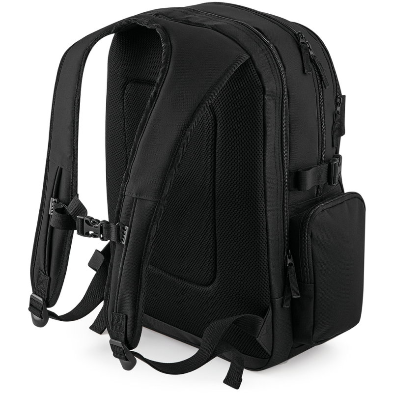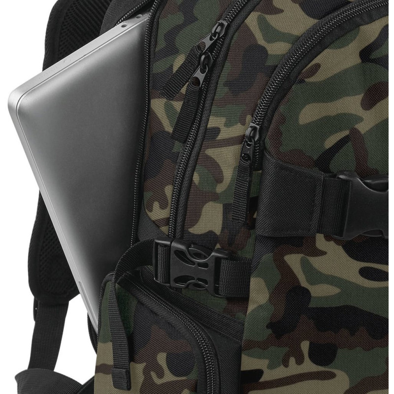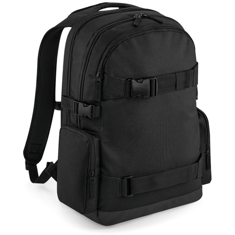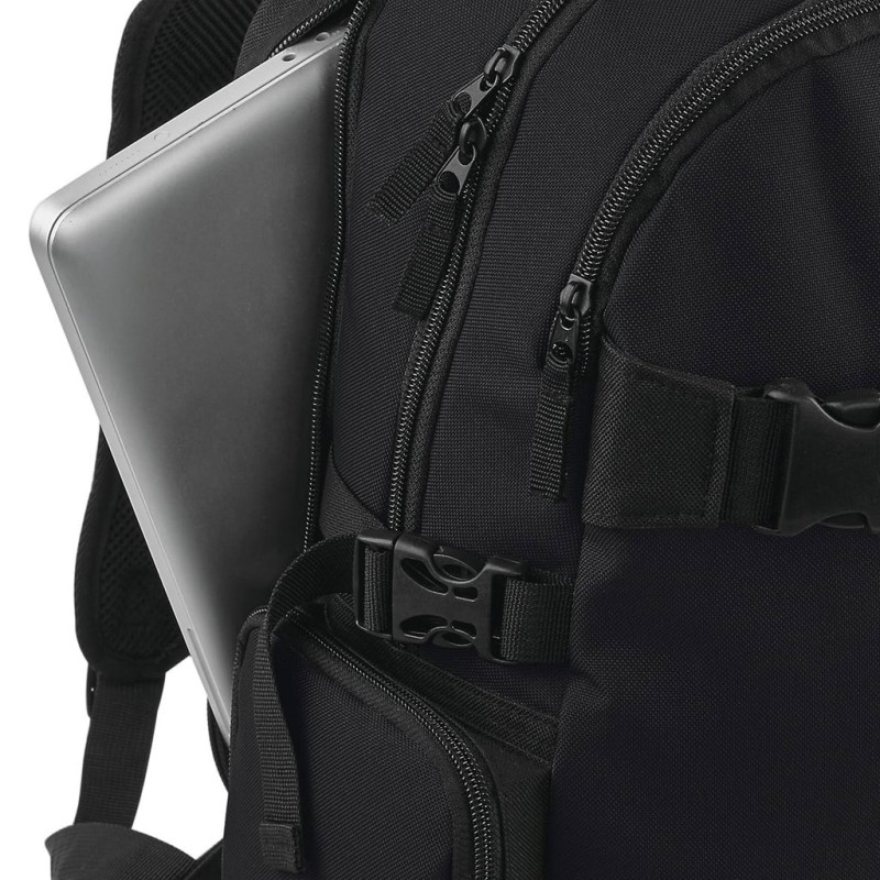 Poliéster 600D. Etiqueta TearAway. Compatível com portátil até 17"". Compartimento para portátil almofadado com acesso pelo exterior. Organizer no interior. Alças de compressão. Bolso frontal com fecho. Bolsos laterais com fecho. Costas acolchoadas. Alças ajustáveis acolchoadas. Alças para transporte de skate. Pega de transporte.