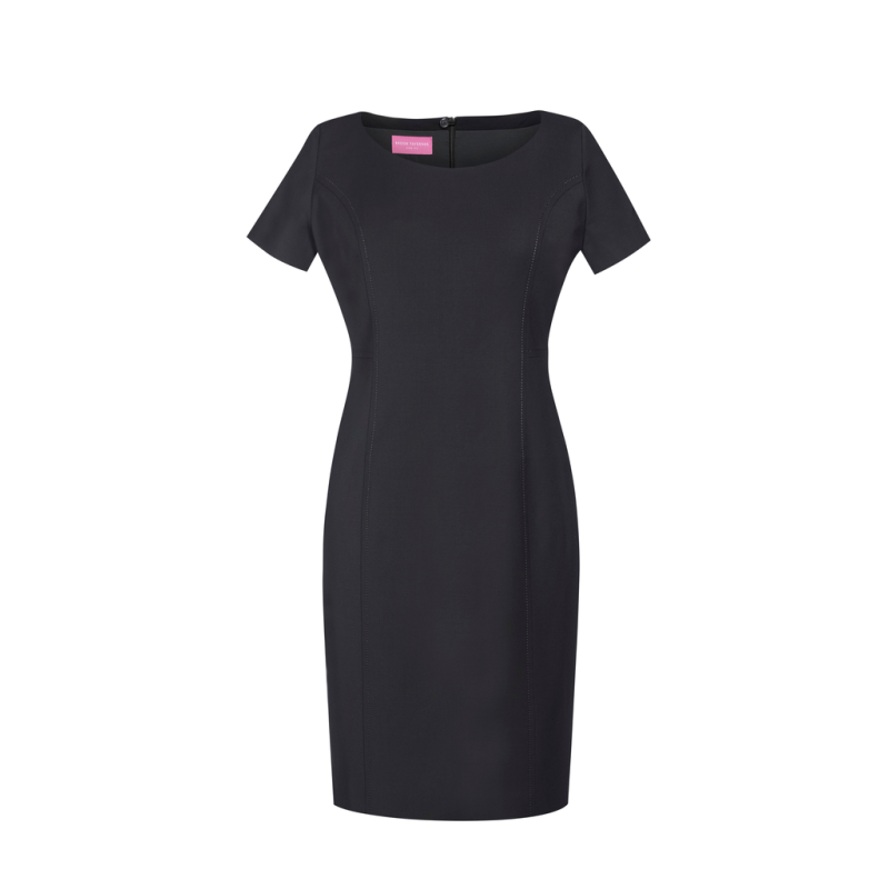 54% poliéster / 44% lã/2% Licra com acabamento antinódoas Nanotech. Vestido clássico, manga curta, costuras decorativas, abertura central na parte traseira, forro extensível. Tecido eficiente: teste borboto 4/5 e teste Martindale: 60 000 fricções sem rasgos. Lavável à máquina a 40° ou limpeza a seco.