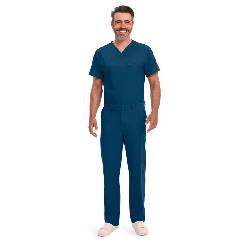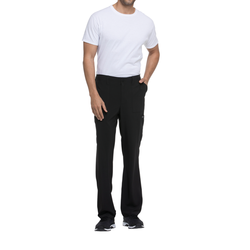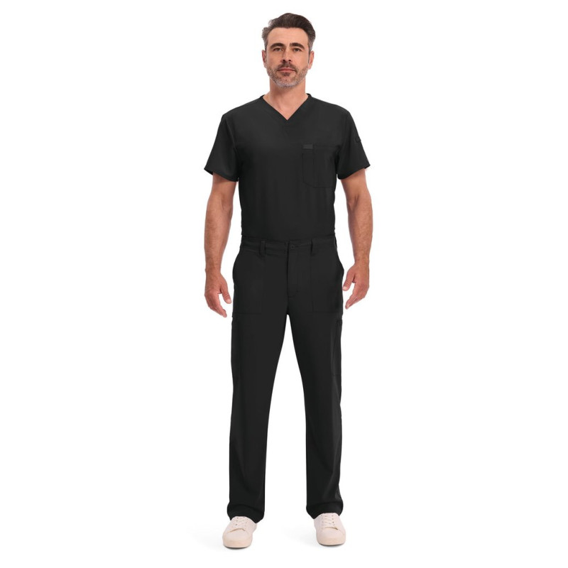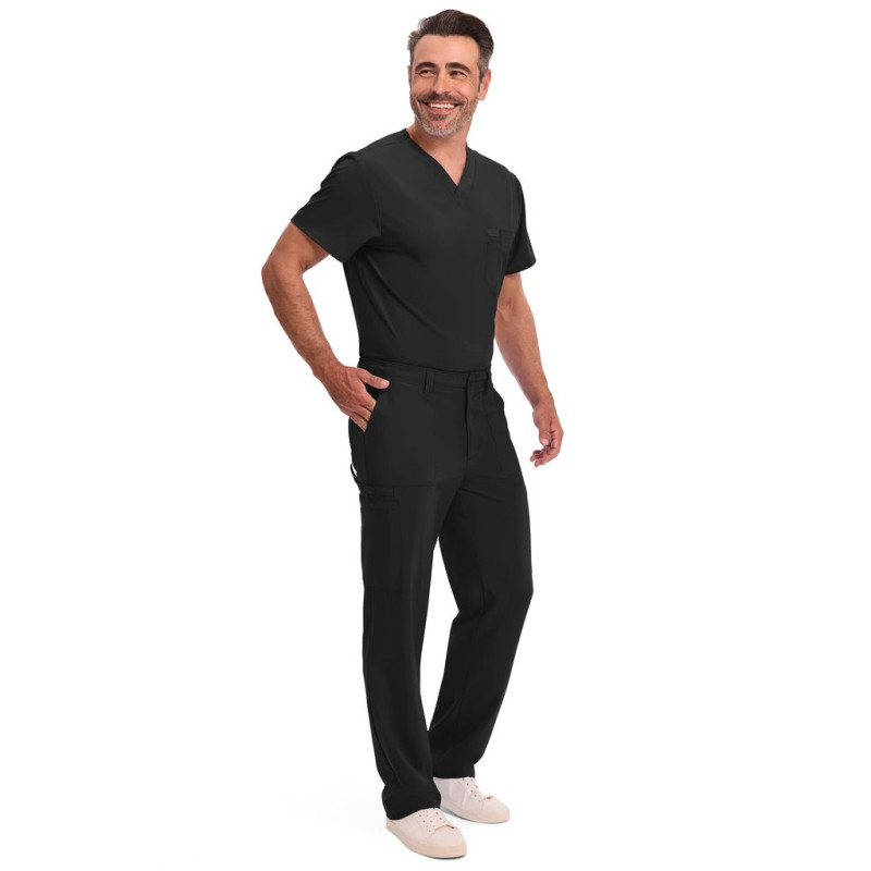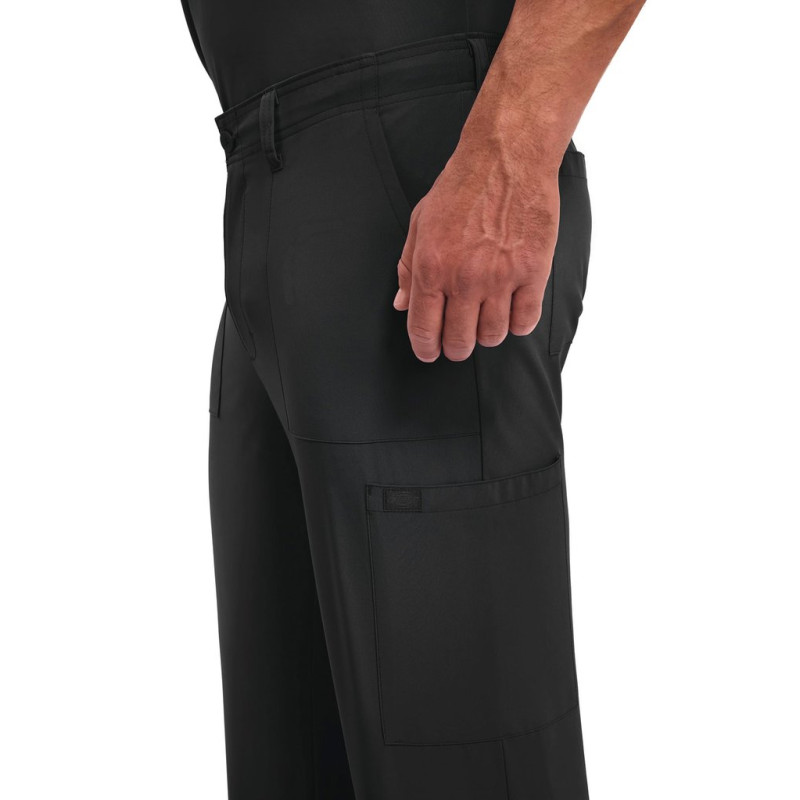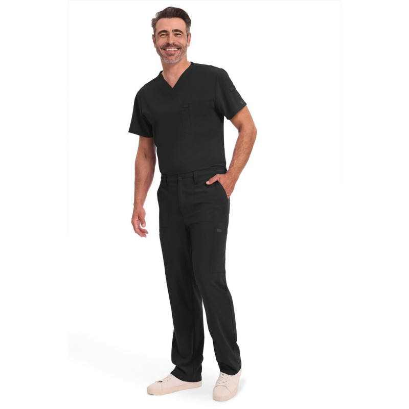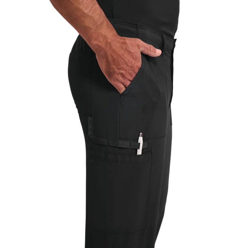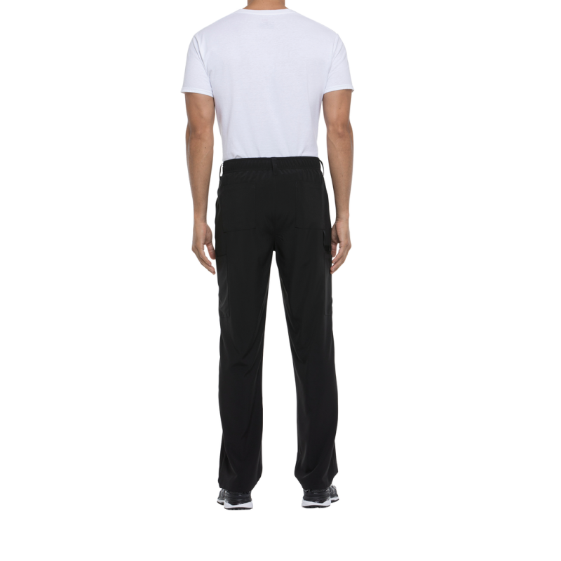 95% poliéster/5% elastano. Corte masculino. Cintura elástica na parte traseira com cordão interior. Braguilha com fecho e botão. Cinco presilhas para cinto. Seis bolsos: dois bolsos frontais planos, dois bolsos cargo, dois bolsos traseiros. Banda em sarja, presilha para instrumentos.