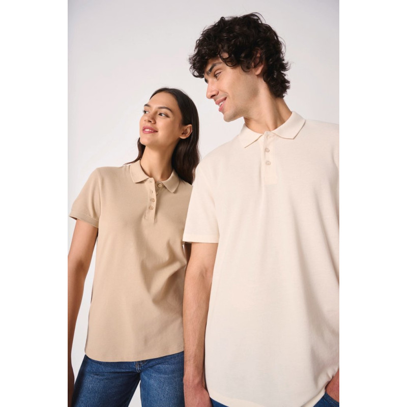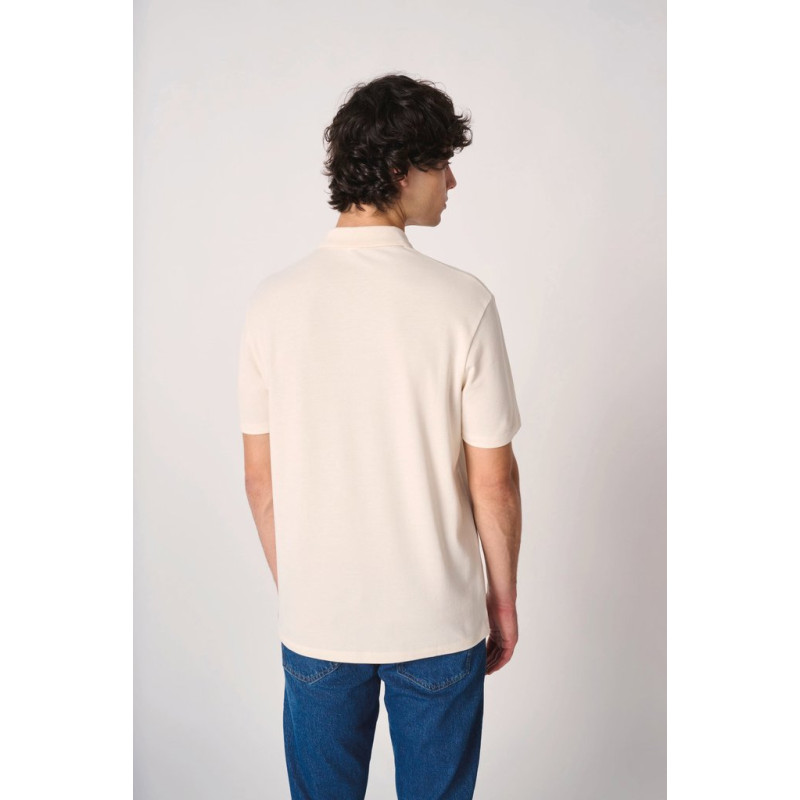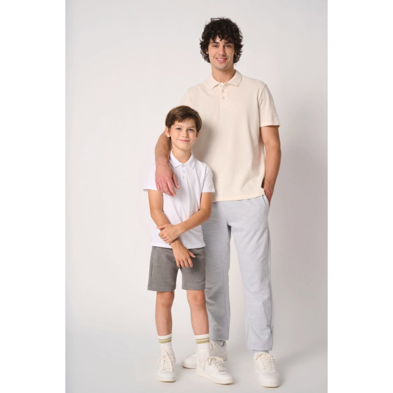 Cores lisas: 100% algodão. Cor Ideal Ash Heather: 99% algodão/1% viscose. Cor Ideal Oxford Grey: 90% algodão/10% viscose. Malha piqué. Corte direito. Colarinho em malha rib 1x1. Carcela com 3 botões tom sobre tom. Tapa-costuras no interior do colarinho tom sobre tom. Aberturas laterais. Bainha das mangas e do cós com costura dupla. Etiqueta de marca amovível.