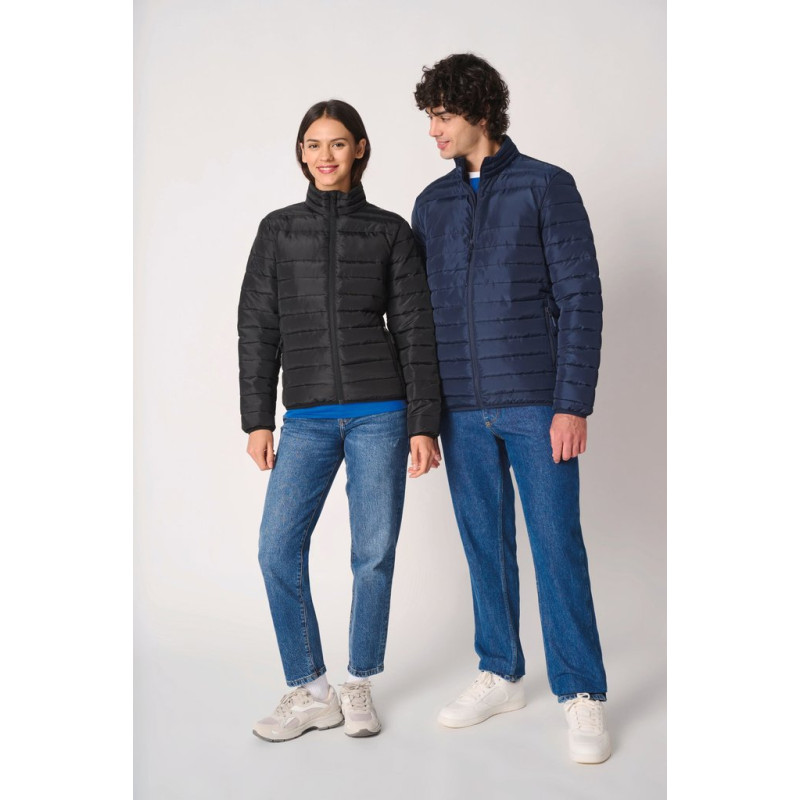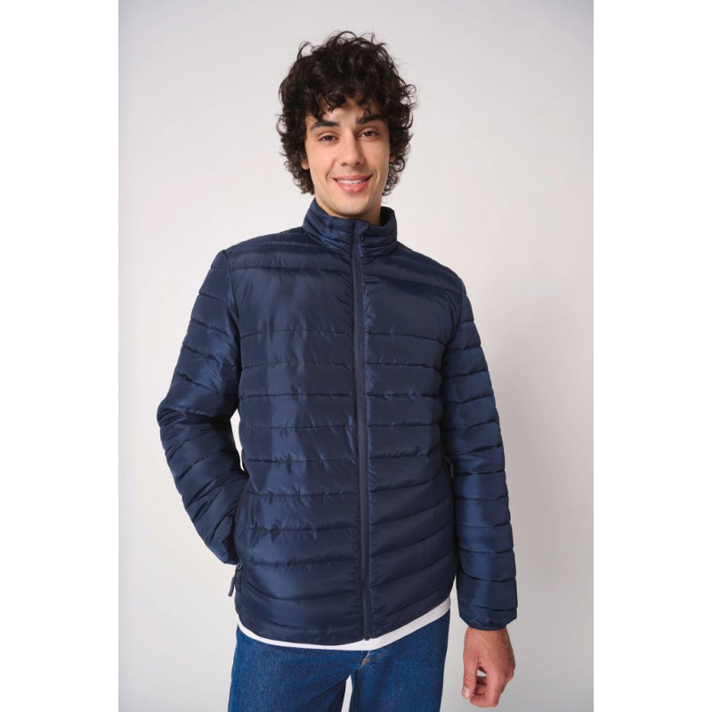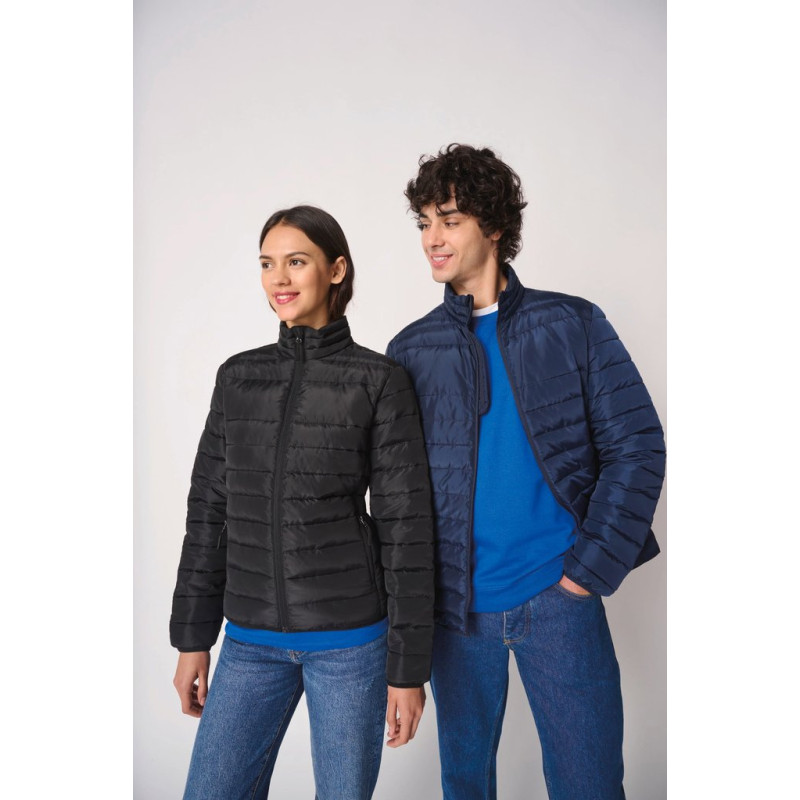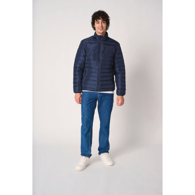 100% poliéster 290T. Enchimento interior: 100% poliéster. Forro: 100% poliéster 290T tom sobre tom. Corte direito. Gola subida. Dois bolsos laterais forrados em 290T, com fechos de nylon e cursores tom sobre tom. Dois bolsos interiores. Fecho de correr em nylon tom sobre tom com protecção de queixo e cursor. Acolchoado na horizontal. Faixa acolchoada mais larga de 11 cm à frente e de 14,5 cm nas costas, para facilitar a personalização. Acabamento das mangas e do cós com recobrimento elástico tom sobre tom. Presilha para pendurar no interior da gola. Produto comprimível no seu saco de arrumação. Etiqueta de marca amovível. Enchimento injectado: o peso pode variar consoante as zonas da peça. O peso total é indicativo.
