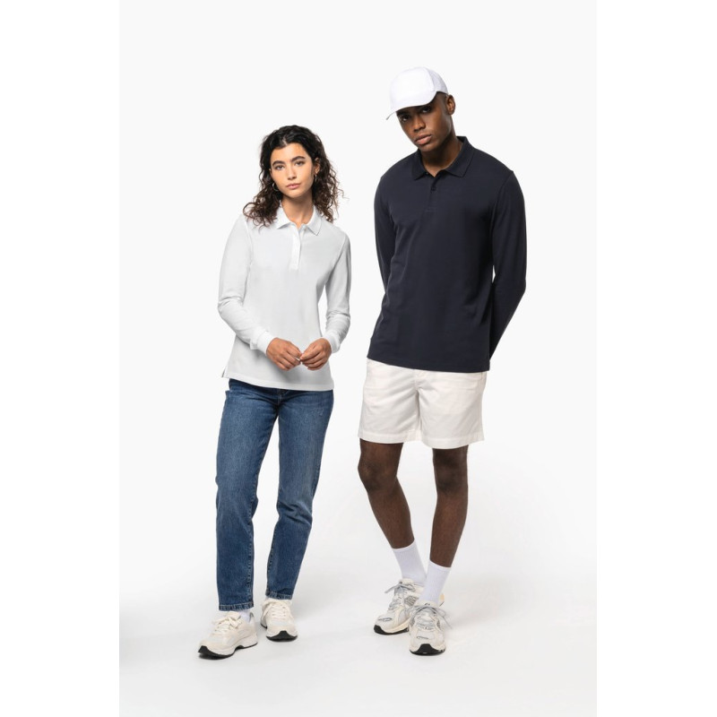 100% algodão biológico. Algodão penteado. Malha piqué. Corte direito. Com banho de enzimas. Manga comprida. Costuras laterais. Colarinho e punhos em malha rib 1x1. Carcela com 2 botões tom sobre tom. Tapa-costuras no material principal tom sobre tom no acabamento interior do colarinho. Reforço nos ombros. Aberturas laterais. Acabamento costura dupla na bainha. Sem etiqueta de marca, apenas indicação de tamanho amovível para facilitar a personalização.
