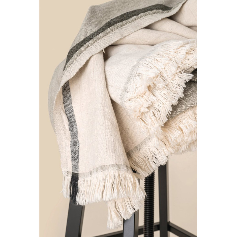100% algodão. Dimensões: 135x195cm (variações possíveis em função da complexidade da tecelagem). Peça lavada. Fouta com franjas nas laterais. Tecido de dupla face, um dos lados mais claro em tons de bege. Riscas decorativas, algumas em contraste nas laterais.