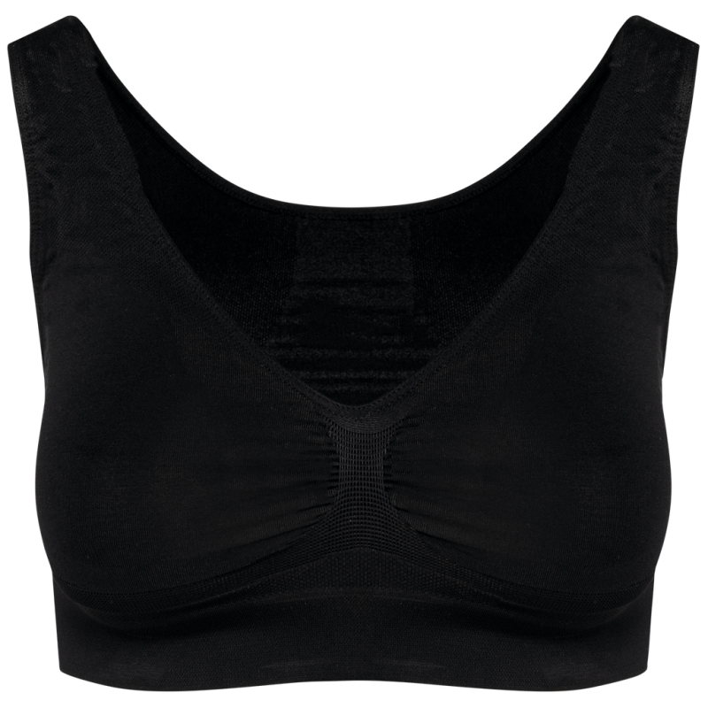 86% poliamida/14% elastano. Concebido com 51% poliamida reciclada pré-consumer. Fio Q-NOVA®. Tecido jersey. Corte justo. Sem costuras. Alças largas. Forma e malha ergonómicas para sustentar o peito e para um conforto máximo. Parte de baixo extensível com costura invisível. Etiqueta da marca Tear Away.