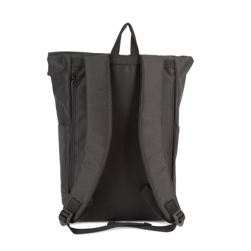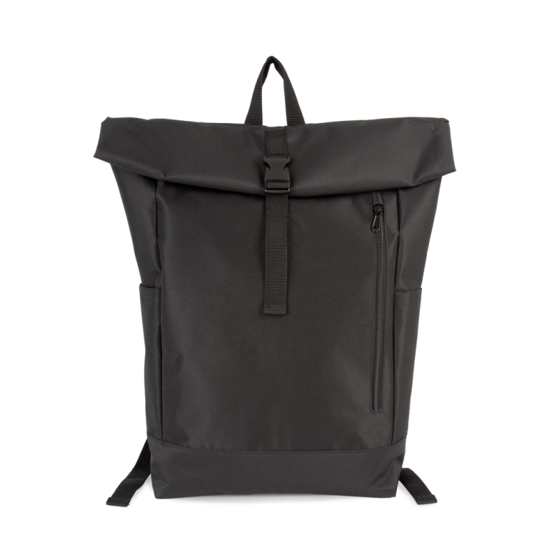 100% poliéster. Mochila com sistema de fecho Roll-Top. Bolso frontal grande para facilitar a personalização. Bolso de segurança nas costas. Alças acolchoadas. Bolsos laterais para arrumação. Compartimento interior acolchoado para o computador portátil com bolso para acessórios ou tablet. Painel interior frontal com bolsos de arrumação e porta-canetas.