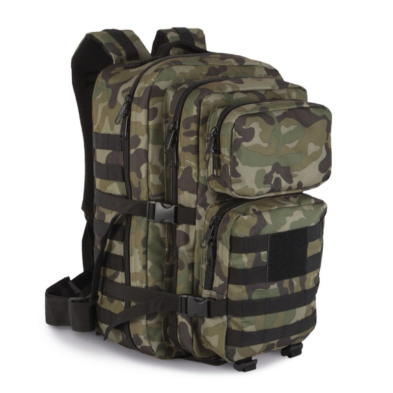 100% poliéster. Mochila MOLLE em poliéster 600D com revestimento impermeável que lhe confere robustez e durabilidade. Ideal para actividades ao ar livre, a mochila tem bolsos para colocação de saco de água, assim como suporte para os tubos, um grande compartimento frontal, uma banda de velcro para ajuste, uma alça MOLLE, cintas para compressão, assim como alças acolchoadas ergonómicas e ajustáveis. Totalmente camuflada.