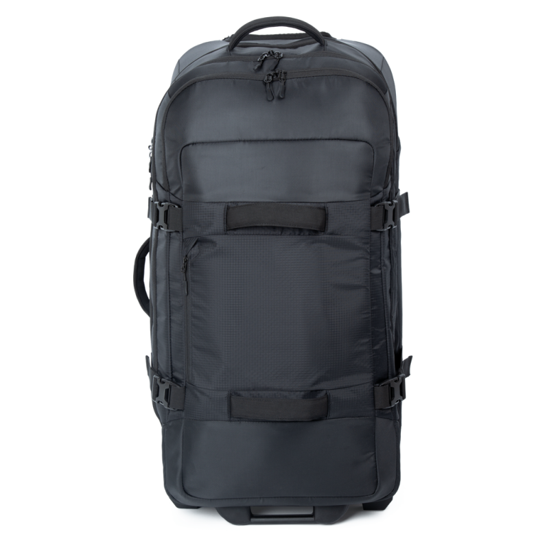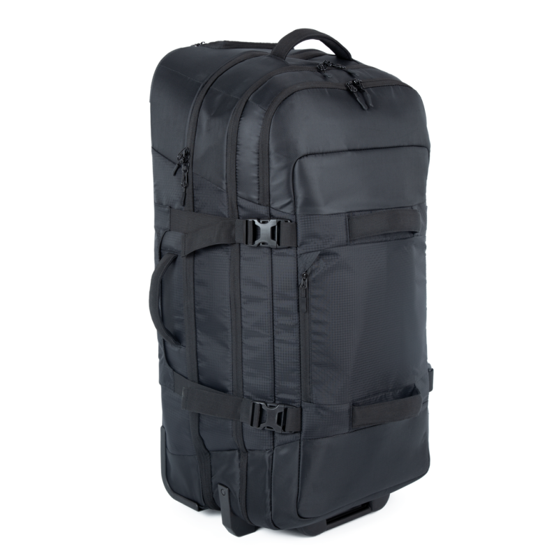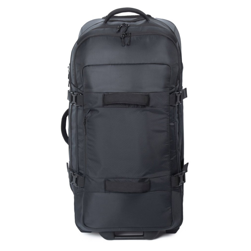 100% poliéster. Trolley XL. Duplo compartimento com painel de divisão com fecho para converter num único compartimento grande. Bolso frontal grande com pega dupla. Sistema de trolley retráctil. Cintas de compressão laterais com fivelas grandes. Pega ao nível das rodas para manter o trolley estável mesmo estando cheio.