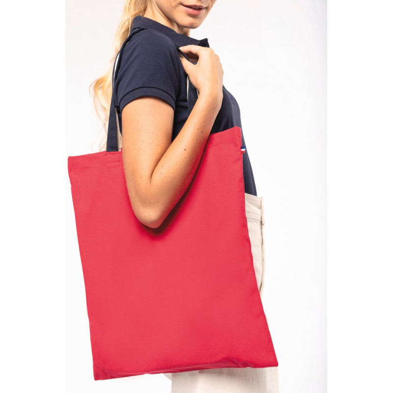 100% algodão. Saco fabricado a partir de tela de algodão. Fabricado em França, este produto possui uma etiqueta «Origine France Garantie», produzido na Bretanha. Uma etiqueta tecida com a bandeira francesa está cosida num dos lados do saco. As alças são em tecido, com 2,5 cm de largura e 50 cm de comprimento, com cores em contraste.