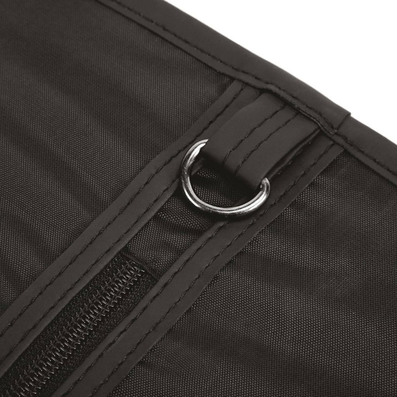 Poliéster 210D. Dobra-se graças a uma pega de transporte. Porta-identificação. Fecho em todo o comprimento.