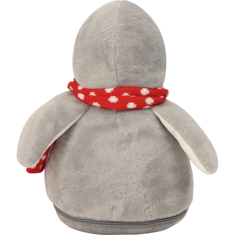 Peluche 100% poliéster branco e cinzento com um cachecol tricotado em contraste. Olhos cosidos. Patas e bico em contraste. Fecho na barriga para acesso para personalização. Enchimento amovível. Em conformidade com a norma europeia EN71 relativa aos brinquedos. Ideal para todas as idades.
