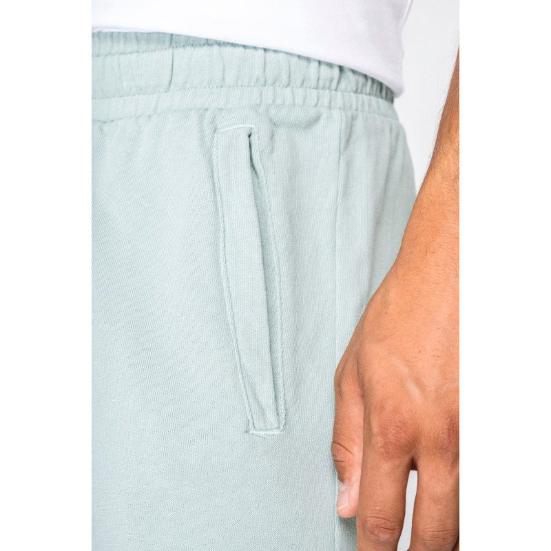 100% algodão biológico. Fabricado em Portugal. Algodão penteado ringspun. Interior não cardado (French Terry). Banho de enzimas. Dois bolsos laterais. Cintura elástica com cordão plano, ilhós e pontas em metal reciclado. Bolsos frontais e traseiros. Peças de vestuário tingidas após montagem: as cores podem variar ligeiramente de uma peça para outra. Este produto é susceptível de tingir em contacto com superfícies ou peças de roupa claras.
