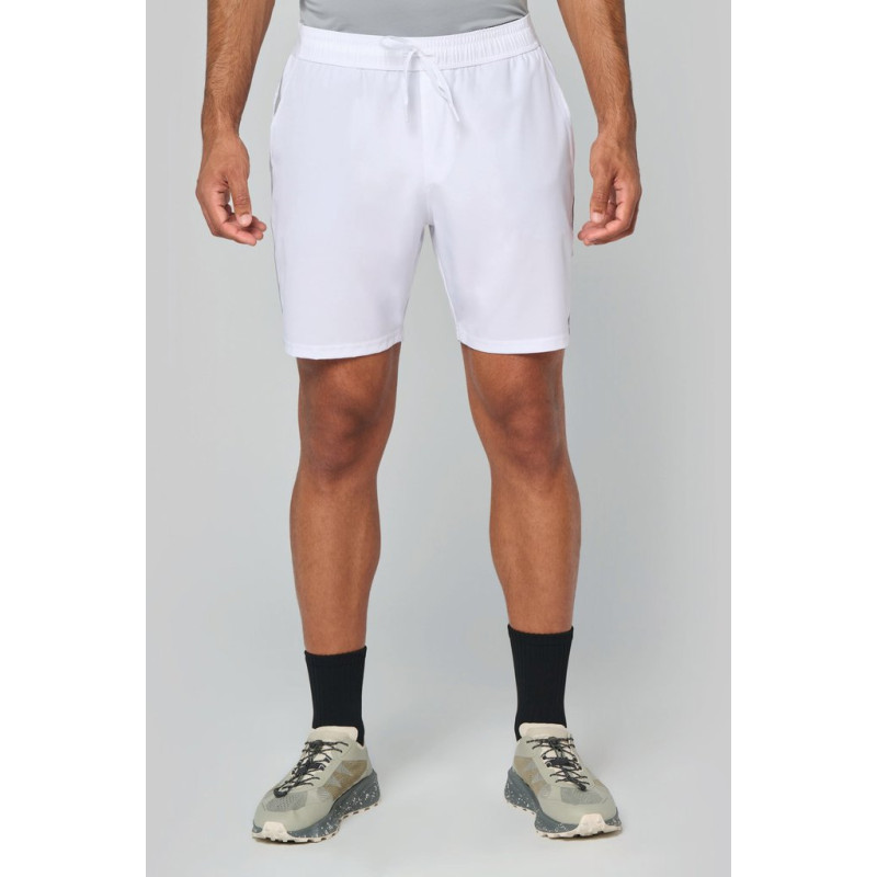 92% poliéster/8% elastano. Material ultraconfortável. 2 bolsos na frente. 2 bandas em rede em contraste aplicadas nas laterais. Cintura elástica com 2 partes com cordão de ajuste plano e ponta em plástico. Acabamento costura dupla na bainha. Etiqueta da marca Tear-away.