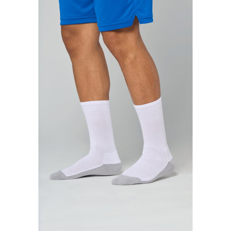 80% algodão / 11% poliéster / 7% poliamida / 2% elastano. Malha turca no interior para maior conforto. Costura plana junto aos dedos dos pés. Malha apertada no tornozelo e na zona central do pé para maior conforto e protecção. Sola em malha cinzenta.