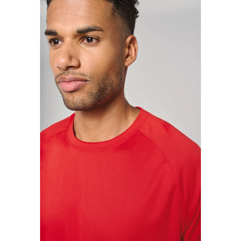 100% poliéster. Malha de micro interlock. Tratamento antiestático. Tecido leve de secagem rápida. Lavável a 40 °C. Corte direito. Material muito leve e confortável para uma grande liberdade de movimentos. Decote redondo no material principal com tapa-costuras tom sobre tom. Mangas raglan em contraste. Acabamento costura dupla na bainha. Etiqueta de marca amovível.