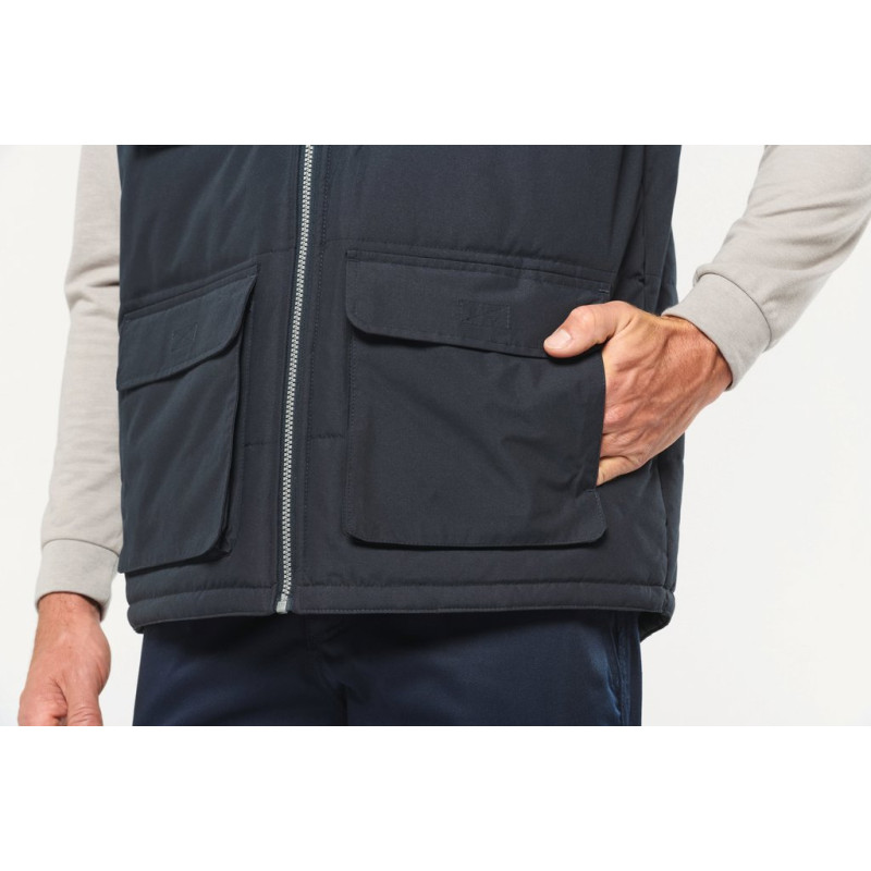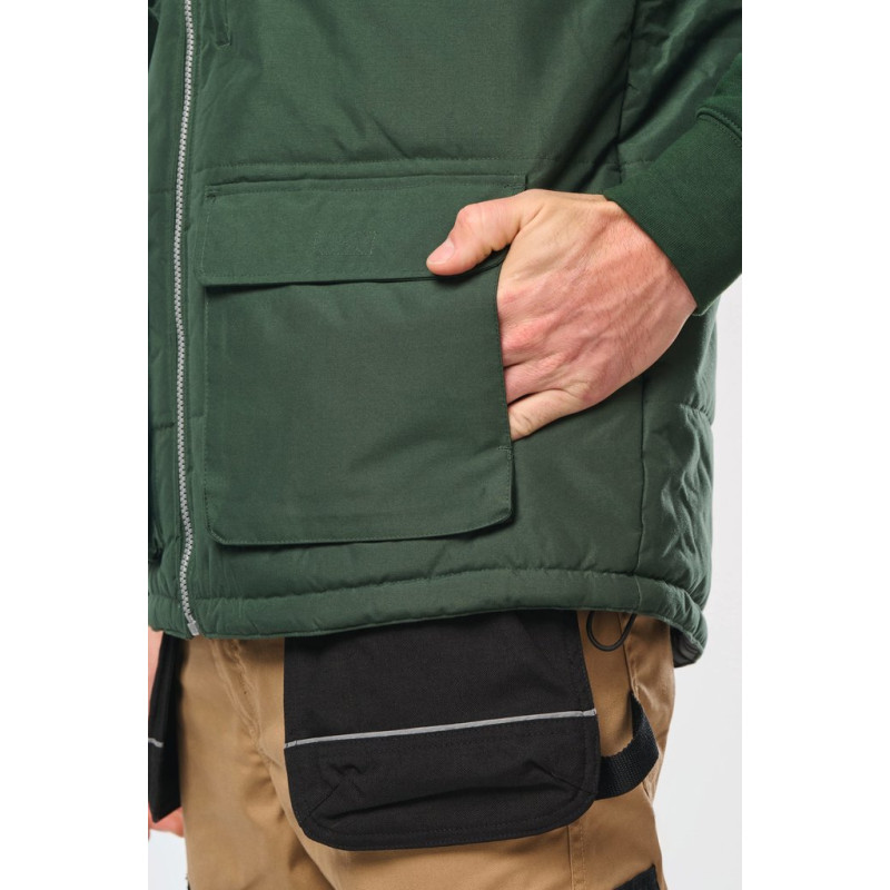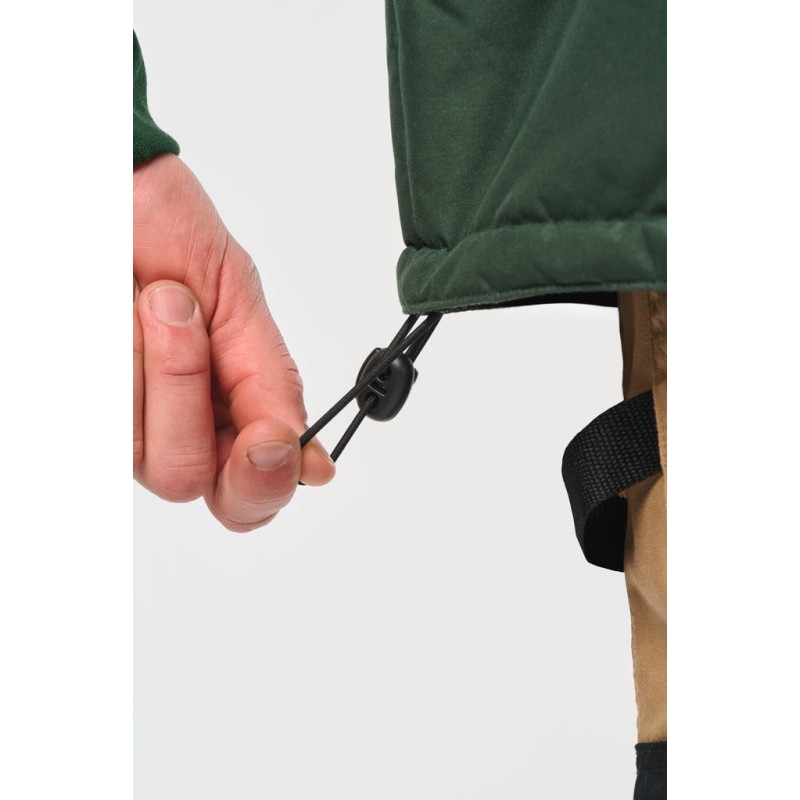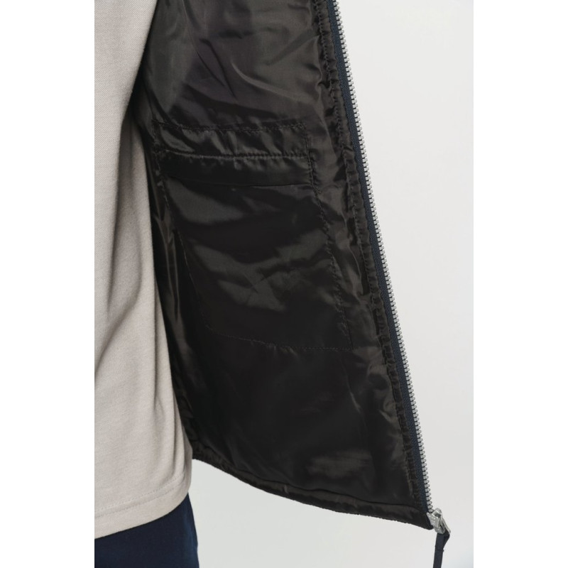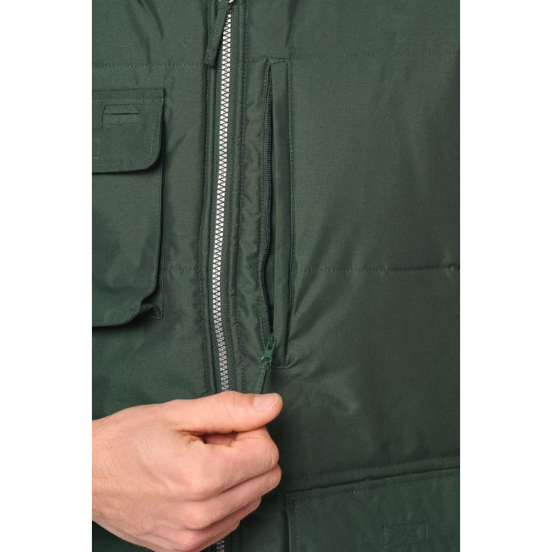 100% poliéster. Microfibra com revestimento em PVC água até 1500 mm. Forro. 100% poliéster. 4 bolsos exteriores. 2 bolsos com palas e fecho em velcro, 1 bolso no peito com acesso para auricular. 1 bolso no peito com fecho. 1 bolso interior com fecho. Gola acolchoada com acesso para auricular. Cordão para ajuste. Fecho frontal na cor cinzenta. Fecho de acesso para personalização.