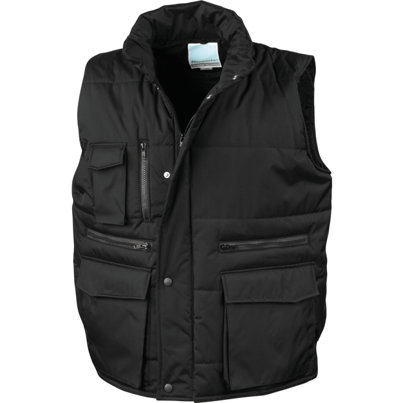 Exterior: poliéster ripstop com revestimento em PVC. Interior: enchimento fibra de poliéster 180 g. Forro: 100% poliéster. Waterproof e anti-vento. Acabamentos com costura dupla. Fecho frontal. 2 bolsos frontais com abertura com três acessos. 1 bolso no peito, 1 bolso exterior para telemóvel e 1 bolso interior. Cavas com rebordos elásticos antifrio. Tecido mais comprido na parte traseira com acabamento elástico. Fecho de acesso para personalização nas costas e no peito.