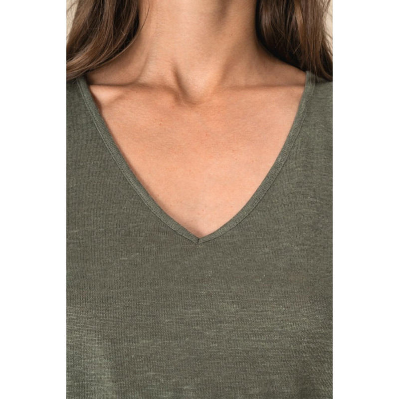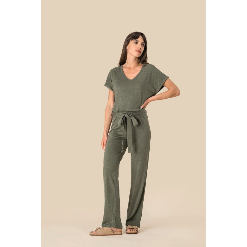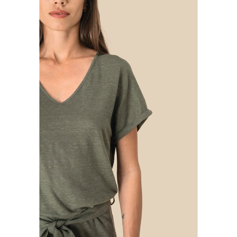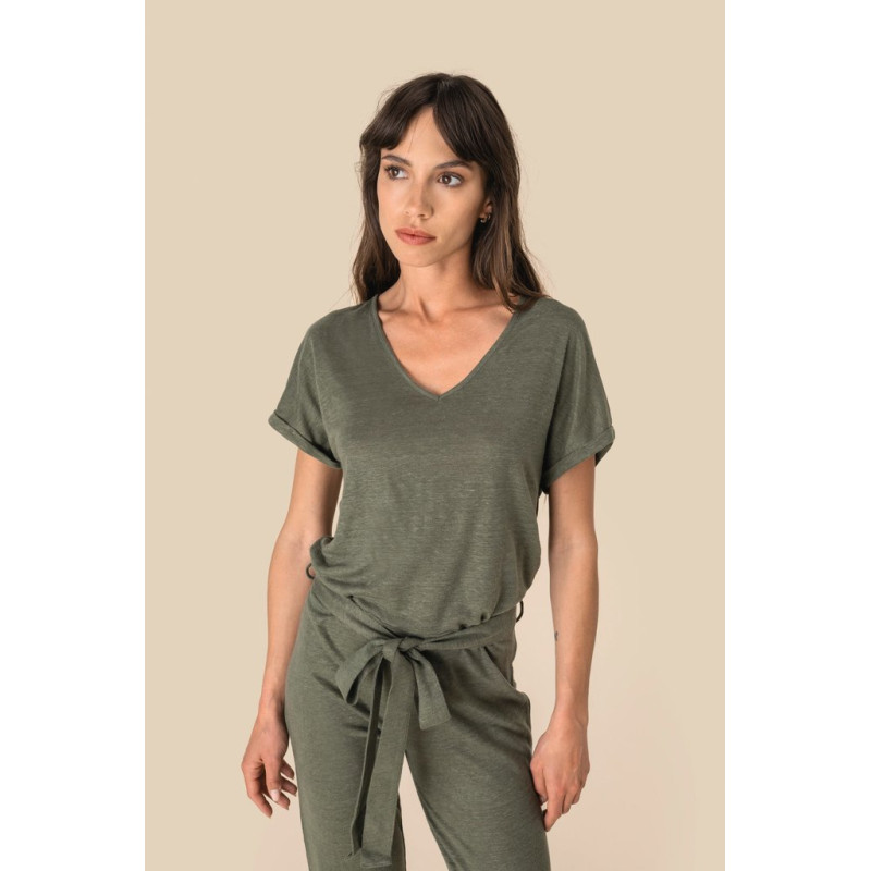 100% linho. Malha. Corte confortável com ombros descaídos. Decote frontal e traseiro V. Costura canelada no decote em viés no material principal. Mangas dobradas presas por pontos. Cintura plana no material principal com presilhas laterais. Costura com pesponto duplo na bainha.