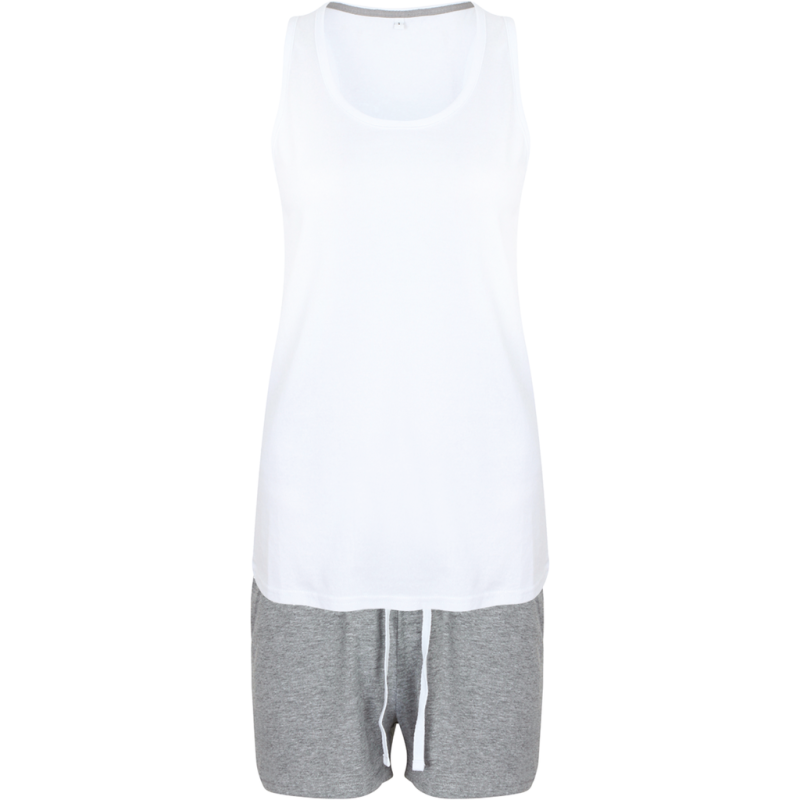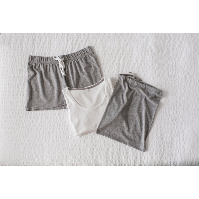 Jersey simples 100% algodão (Heather Grey: 85% algodão/15% viscose). Kit pijama com: 1 t-shirt de cavas White tipo asa delta + 1 calções com cós elástico + 1 saco com cordão.