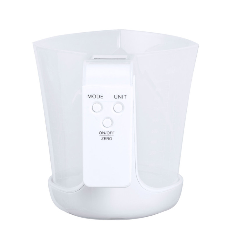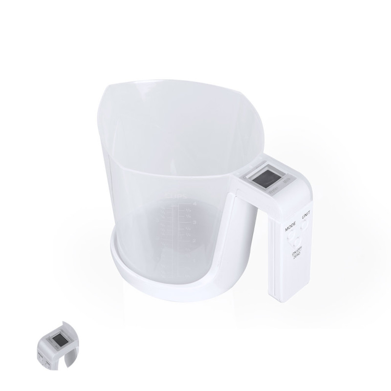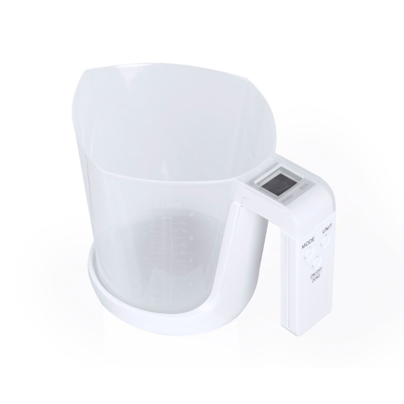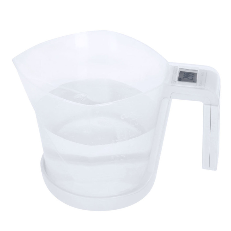 Balança com jarro medidor integrado, fabricada numa resistente combinação de PP e ABS. Ecrã LCD com controlo por botões e função de tara, com capacidade máxima para 5 kg de peso e adequada para medir líquidos ou sólidos.Inclui um Jarro medidor de 1L de capacidade, com uma multiplicidade de opções e um vertedor para evitar derrames:-1L, com medidor lateral em secções de 50 ml.-32 oz, com medidor lateral com secções de 2 oz. -Medição rápida do volume de canecas.Funciona com pilha de botão (incluída) e vem apresentada individualmente em caixa.