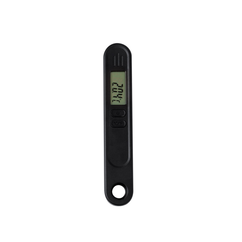 Termómetro digital com sonda metálica. Ideal para medir a temperatura no interior de objectos graças à sua sonda metálica. Prático mecanismo de dobragem para uma arrumação segura em qualquer lugar, com anel e íman na parte de trás. Ecrã LCD, com botão ON/OFF e possibilidade de medição em graus Celsius (Cº) ou Fahrenheit (ºF). Intervalo de medição entre -50ºC e até 300ºC, com manual de instruções em espanhol e inglês. Alimentado por uma pilha de botão (incluída) e apresentado individualmente numa caixa de design kraft.