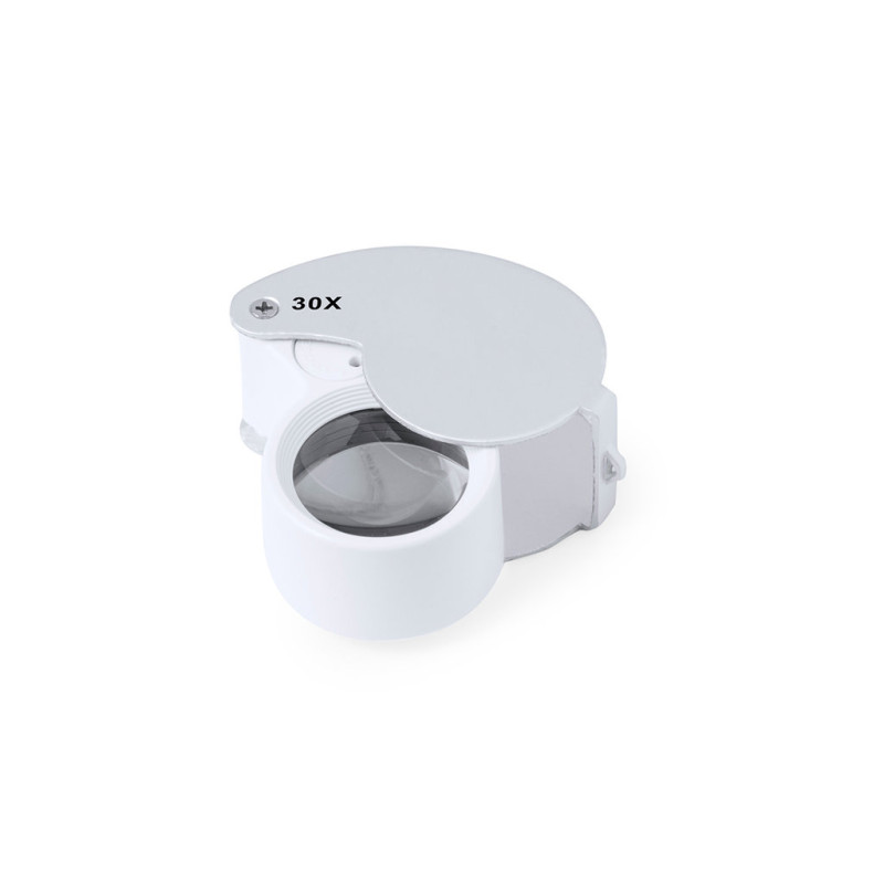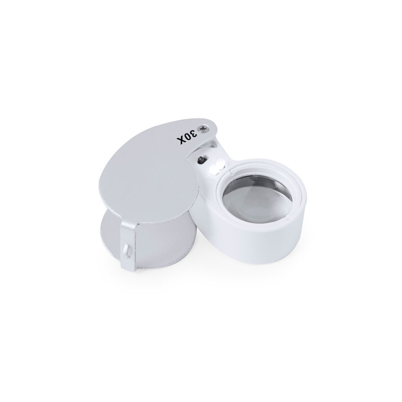 Lupa dobrável dupla com ampliação 30x, fabricada em resistente metal. Com luzes LED integradas e grande potência de ampliação para obter uma visão muito próxima dos mais pequenos detalhes e uma ampliação sem distorção. Ideal para inspecionar objectos de tamanho reduzido, textos, etc. Também tem um acessório para pendurar, e vem dentro de um estojo com interior almofadado para uma maior proteção. Alimentação a pilhas (pilhas de botão incluídas), com chave especial para as substituir quando estas se esgotam. Apresentado numa caixa de cartão preta.