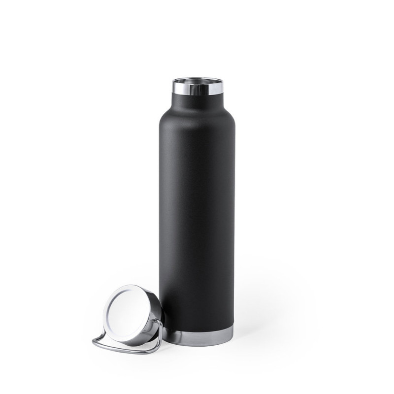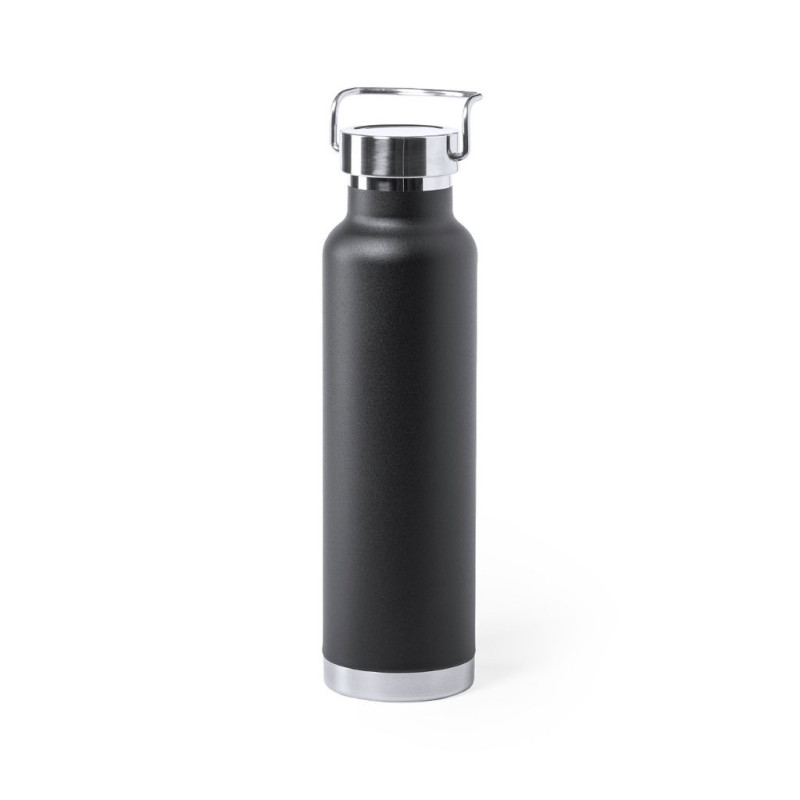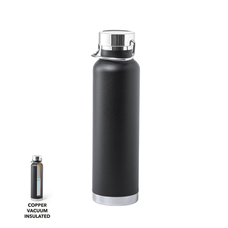 Garrafa térmica de aço inox, com dupla parede e isolamento de cobre a vácuo. O mesmo permite manter o quente e o frio durante mais tempo, podendo chegar a 12 e 48 horas respectivamente. De 650ml de capacidade e disponível numa variada gama de cores metálicas. Apresentado numa caixa de design atrativo.