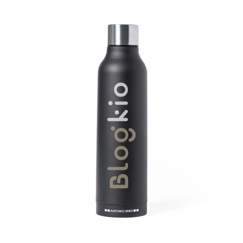 Termo de aço inoxidável Antonio Miró. De 500ml de capacidade e com parede dupla para uma melhor e mais duradoura conservação da temperatura. Com um acabamento preto acetinado sóbrio, logótipo da marca na base e tampa de rosca cromada. Apresentado numa atrativa caixa de design com logótipo da marca.