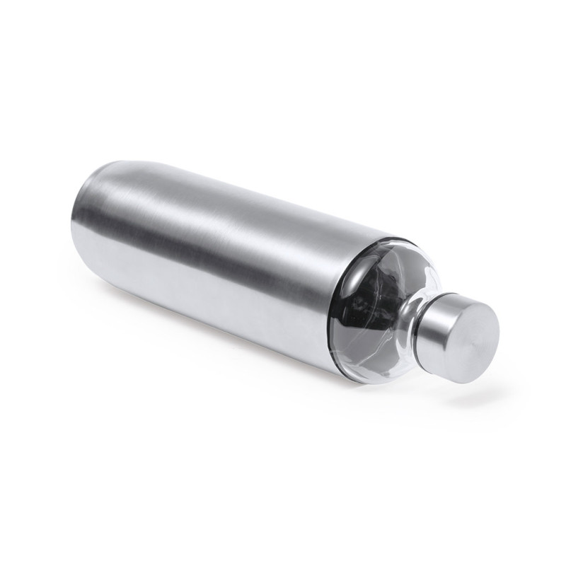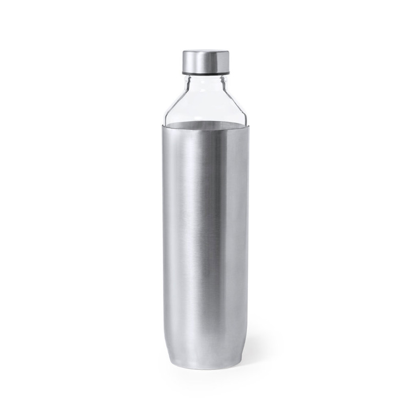 Garrafa de design de alta qualidade, de 850 ml de capacidade. Fabricada em virdo de borossilicato, que oferece uma resistência, estética e durabilidade excecionais, prolongando a sua vida útil e podendo ser reutilizada inúmeras vezes. Tampa e bolsa do corpo da garrafa em aço inox. Apresentada em atrativa caixa de design.