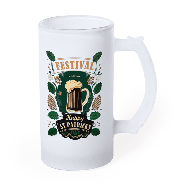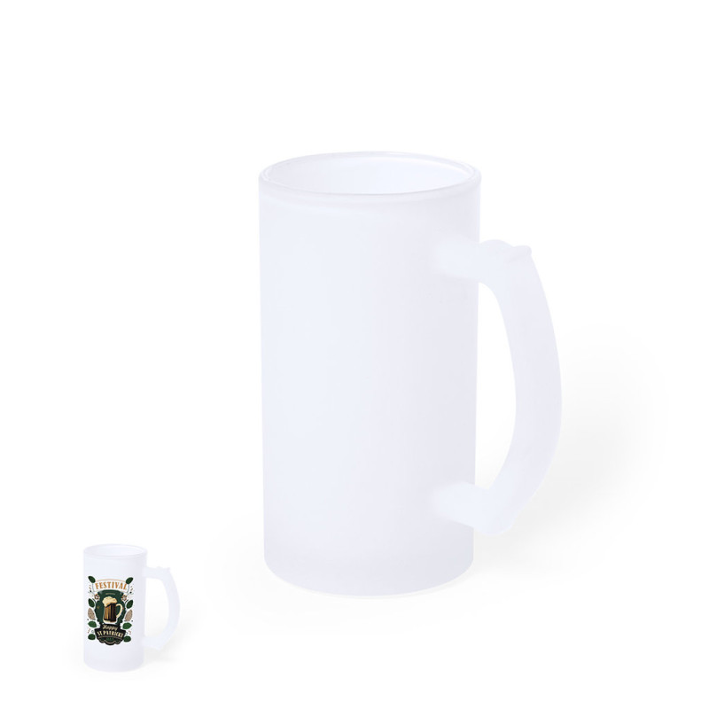 Caneca de vidro de acabamento mate. De 500 ml de capacidade e com prática pega. Especialmente desenhada para a sublimação. Apta para micro-ondas e apresentada em caixa individual kraft.