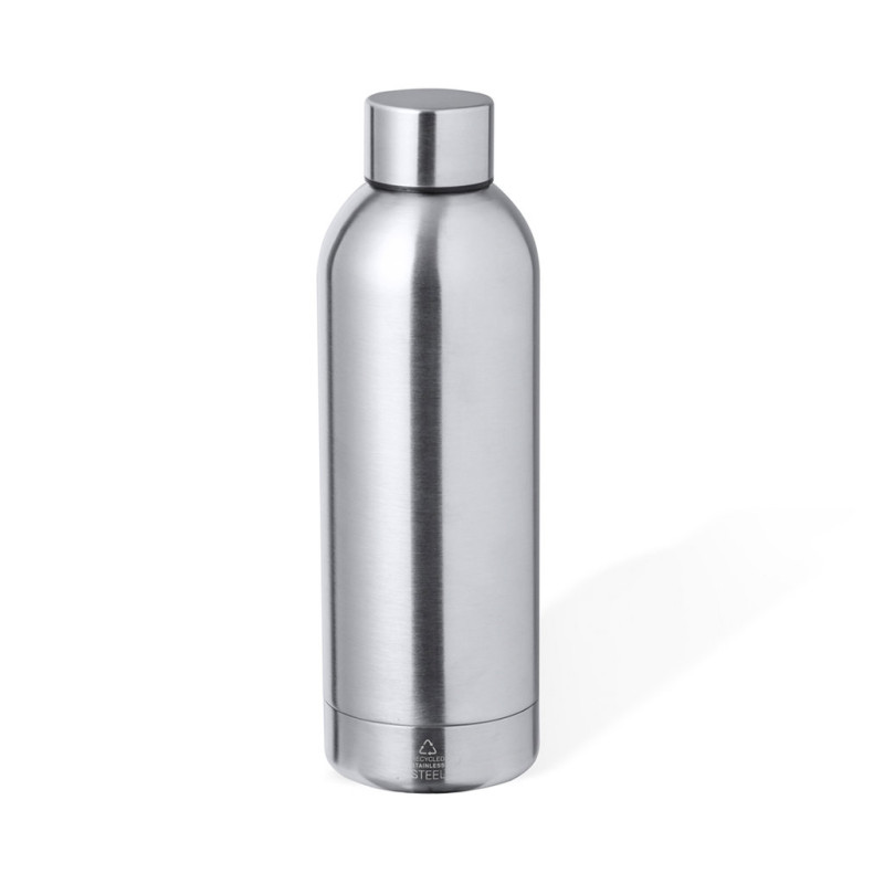 Garrafa térmica de dupla camada em Aço Inoxidável Reciclado de 500 ml de capacidade. Fecho de rosca para uma ótima vedação e com logotipo Aço Inoxidável Reciclado. Apresentada numa atrativa caixa de design kraft.O aço é um dos materiais mais solicitados e que pode encontrar-se quase em todas as partes, desde produtos de uso diário a grandes construções. Com inúmeras propriedades, entre as quais há que destacar a durabilidade e o seu alto grau de reutilização, convertendo-o numa alternativa muito valorizada em soluções de sustentabilidade. Devidamente tratado, permite obter novos recursos de infinita utilização.