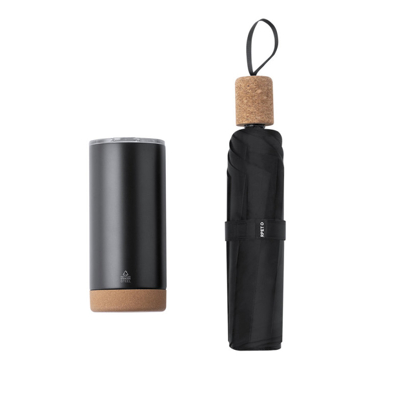 Elegante set premium que inclui: Copo térmico de parede dupla em Aço Inoxidável Reciclado e 550 ml de capacidade, com elegante acabamento preto mate. Base de cortiça, com tampa de pressão e doseador. É ideal para ter na sua escrivaninha, mesa ou em qualquer superfície onde possa desfrutar tranquilamente da sua bebida favorita. Guarda-chuva dobrável de cor preta com 98cm de diâmetro. Em material pongee 190T RPET e pega de cortiça. De abertura manual, com sistema antivento e varetas em fibra de vidro. Com etiqueta distintiva RPET. Set apresentado em estojo ndividual de acabamento mate, com recorte interior para cada um dos elementos do set. O material RPET é elaborado a partir de plástico reciclado, para assim fomentar a reutilização de resíduos plásticos e ajudar à sustentabilidade do planeta.
