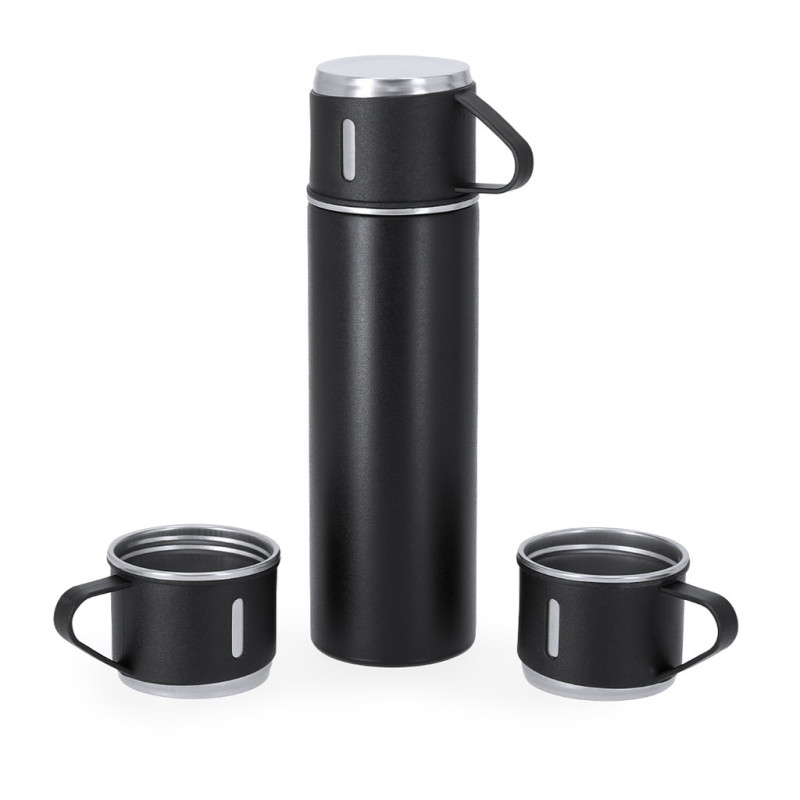 Conjunto de garrafa térmica e 3 copos feitos de aço inoxidável. Garrafa térmica de parede dupla com capacidade de 420 ml, garantindo uma melhor conservação da temperatura por mais tempo, com dispensador de segurança. Copos de 140 ml com ajuste de rosca em um elegante design preto, ótimos para desfrutar de uma bebida quente ou fria, a qualquer hora e em qualquer lugar. Apresentado em um elegante estojo preto.