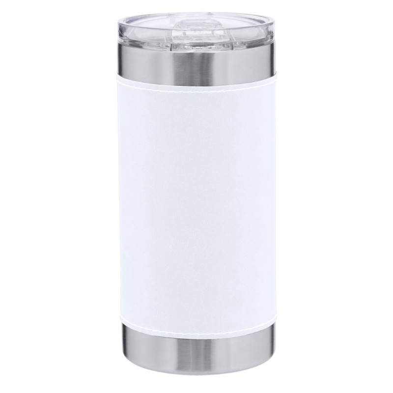 Caneca isolada feita de aço inoxidável de parede dupla e PU sofisticado. Com capacidade de 530 ml. Inclui uma elegante capa de PU com costura branca distinta. Inclui uma tampa transparente com dispensador, de fácil abertura e livre de BPA. É ideal para ter na sua escrivaninha, mesa ou em qualquer superfície onde possa desfrutar tranquilamente da sua bebida favorita.