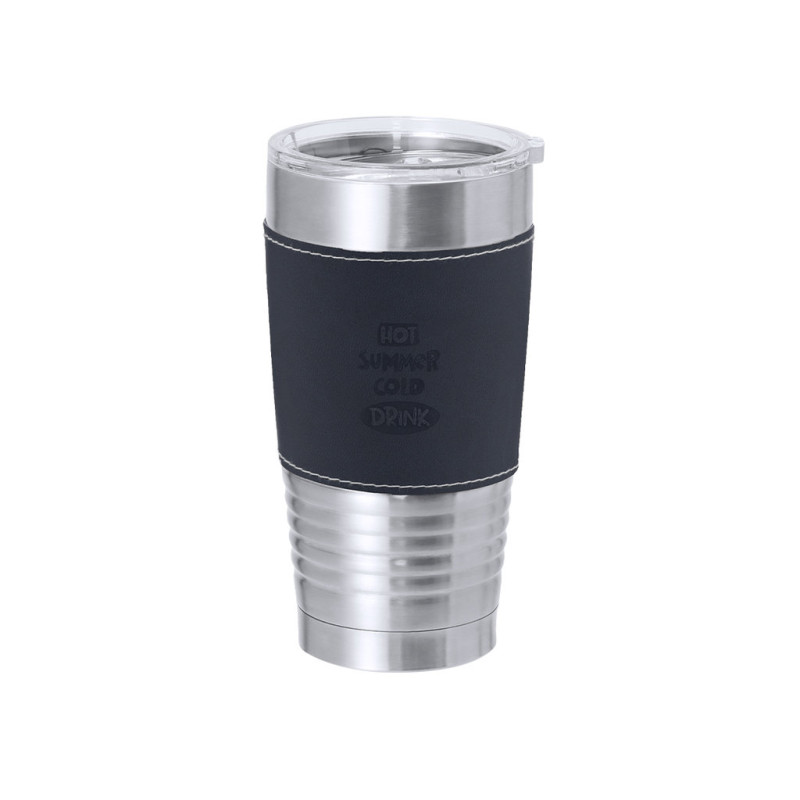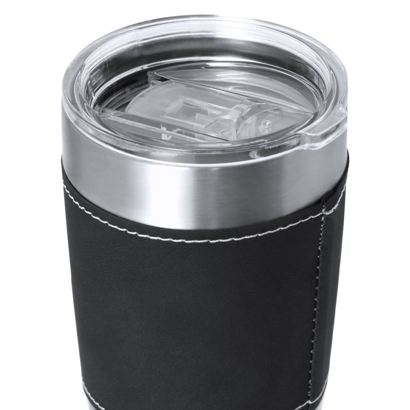 Caneca isolada feita de aço inoxidável de parede dupla e PU sofisticado. Com capacidade de 420 ml. Inclui uma elegante capa de PU com costura branca distinta. É ideal para ter na sua escrivaninha, mesa ou em qualquer superfície onde possa desfrutar tranquilamente da sua bebida favorita. Inclui tampa transparente com dispensador de fácil abertura, livre de BPA.