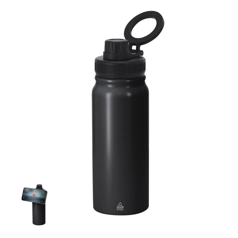 Garrafa térmica de 600 ml de capacidade, fabricada em Aço Inox Reciclado de dupla parede. Com função suporte magnético rotativo para smartphone. Livre de BPA. Inclui distintivo de aço inox reciclado.O aço é um dos materiais mais demandados e pode ser encontrado quase em todos os lugares, desde produtos de uso diário até grandes construções. Com inúmeras propriedades, entre as quais se destaca a durabilidade e seu alto grau de reutilização, tornando-se uma alternativa muito valorizada em soluções de sustentabilidade. Devidamente tratado, permite obter novos recursos de infinita utilização.