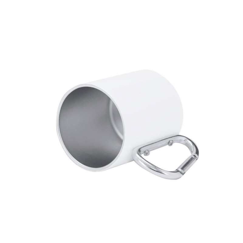 Caneca de aço inox de 220ml, com corpo de acabamento branco brilhante metálico e uma funcional alça em forma de mosquetão podendo ser fácil de transportar. Especialmente projetada para sublimação.