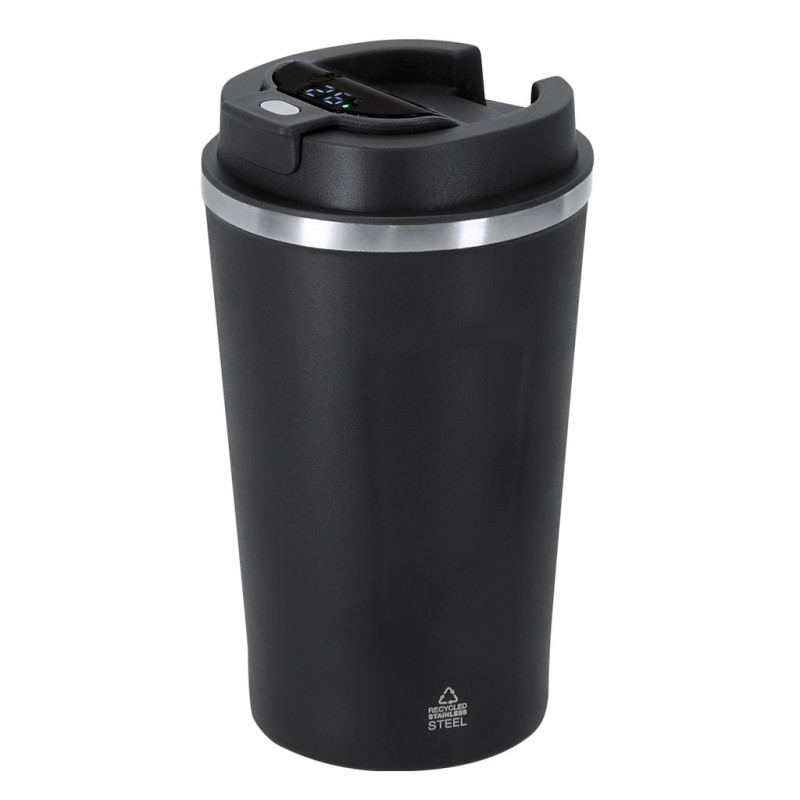 Copo térmico com capacidade de 400 ml, fabricado em Aço Inoxidável Reciclado. Incorpora ecrã tátil na tampa que mostra a temperatura interior com um simples toque. Conta com tampa de segurança para fecho hermético. Livre de BPA. Inclui distintivo em aço inoxidável reciclado. Alimentado a pilhas. Não apto para máquina de lavar loiça.