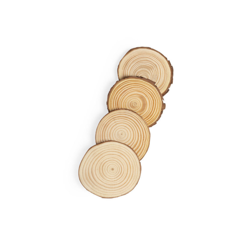 Coaster em madeira de pinheiro natural. Incluindo 4 peças em torno de 1 cm de espessura. Corte natural, com diâmetros de montanha-russa em torno de 8 a 10 cm, incluindo corda em material de juta natural.