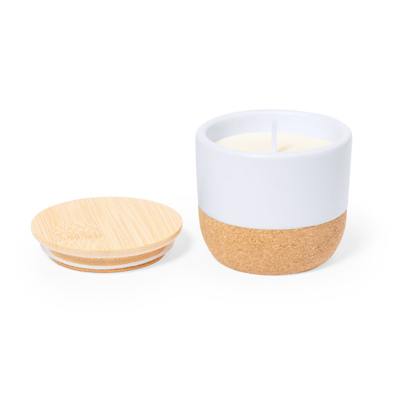 Vela aromática com perfume linho. Vem num original frasco de cerâmica de cor branca, com base fabricada em cortiça natural e tampa de bambu. Apresentada numa caixa individual de design kraft.