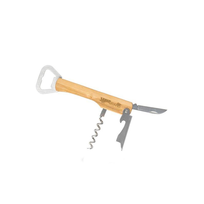 Saca-rolhas multifunções com acabamento em bambu e aço inoxidável, equipado com abre-cápsulas, canivete e abridor de garrafas. Uma ferramenta elegante e resistente, ideal para momentos de convívio, piqueniques ou jantares especiais. Graças ao seu design compacto e funcional, permite-lhe abrir uma garrafa de vinho ou cerveja com facilidade e estilo, sempre que quiser e com quem quiser. Uma opção prática e ecológica, perfeita como brinde ou acessório pessoal.